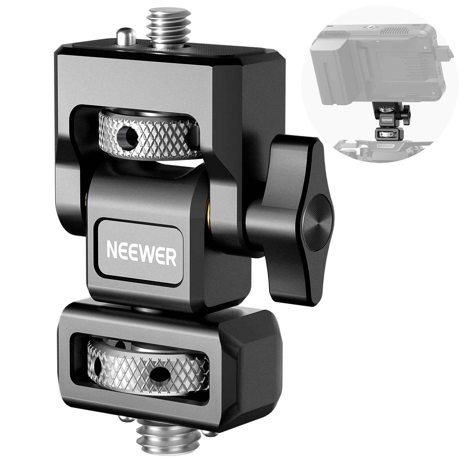- Diseño doble antigiro : tornillo superior de 1/4" con pasador de localización antigiro retráctil y almohadilla de silicona antideslizante que bloquea de forma segura NEEWER F100 F200 F400 PRO F500 y otros monitores (compatible con Atomos Ninja V Ninja V+). Además, el tornillo moleteado permite una mano rápida fijación y ranuras con llave hexagonal en forma de L incluida brindan mayor seguridad para volver a apretar