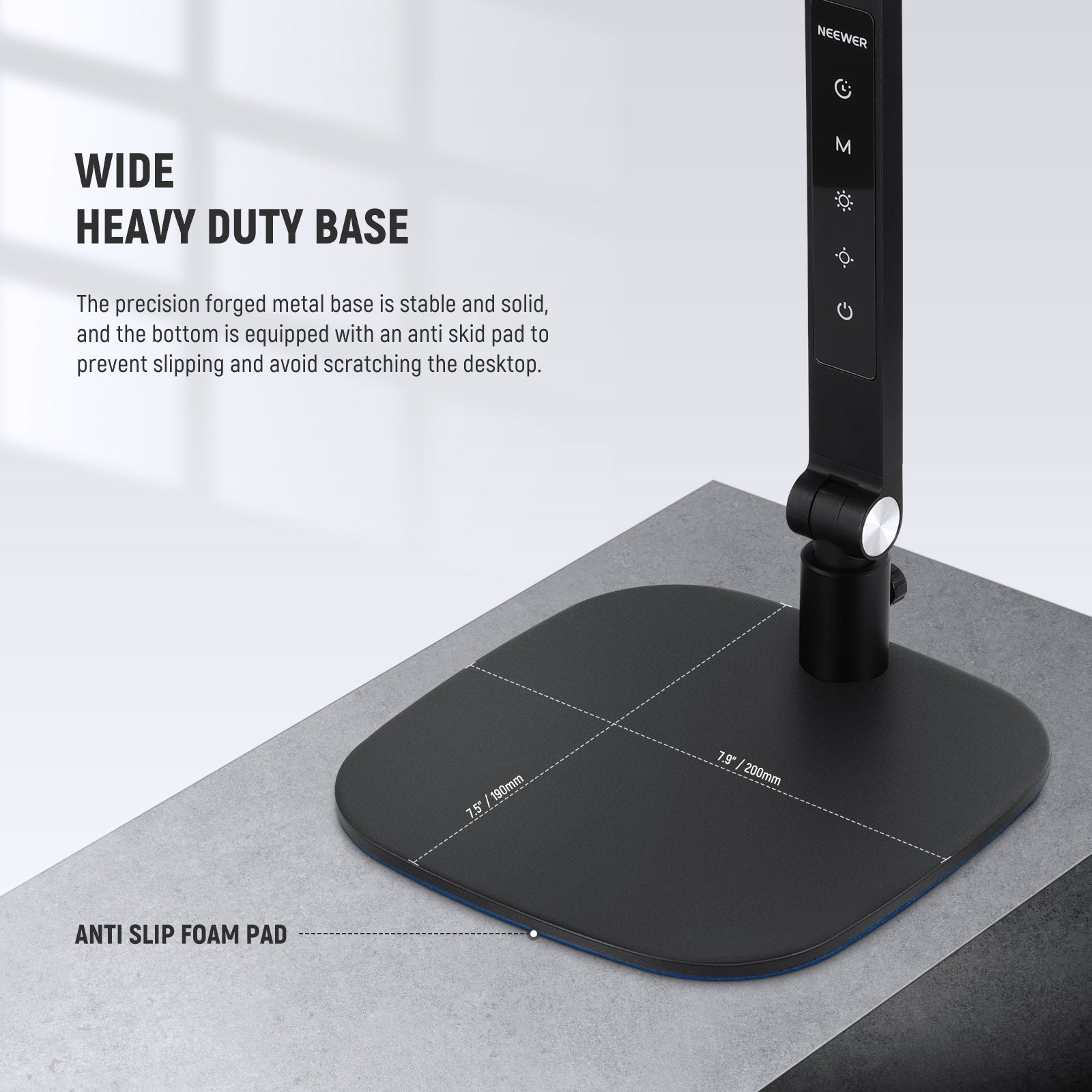 - Wide Heavy Duty Base- Unlike other clamp mounted table lamps that require laborious installation and are limited to the desk edge, NEEWER small panel desk light features a large, heavy aluminum alloy base (7.5"x7.9"x0.3"/190x200x7mm) that provides stable support on any flat surface. This allows for easy and flexible movement without the need for effortful mounting and dismounting. Plus, the bottom has soft foam padding to ensure nonslip stability