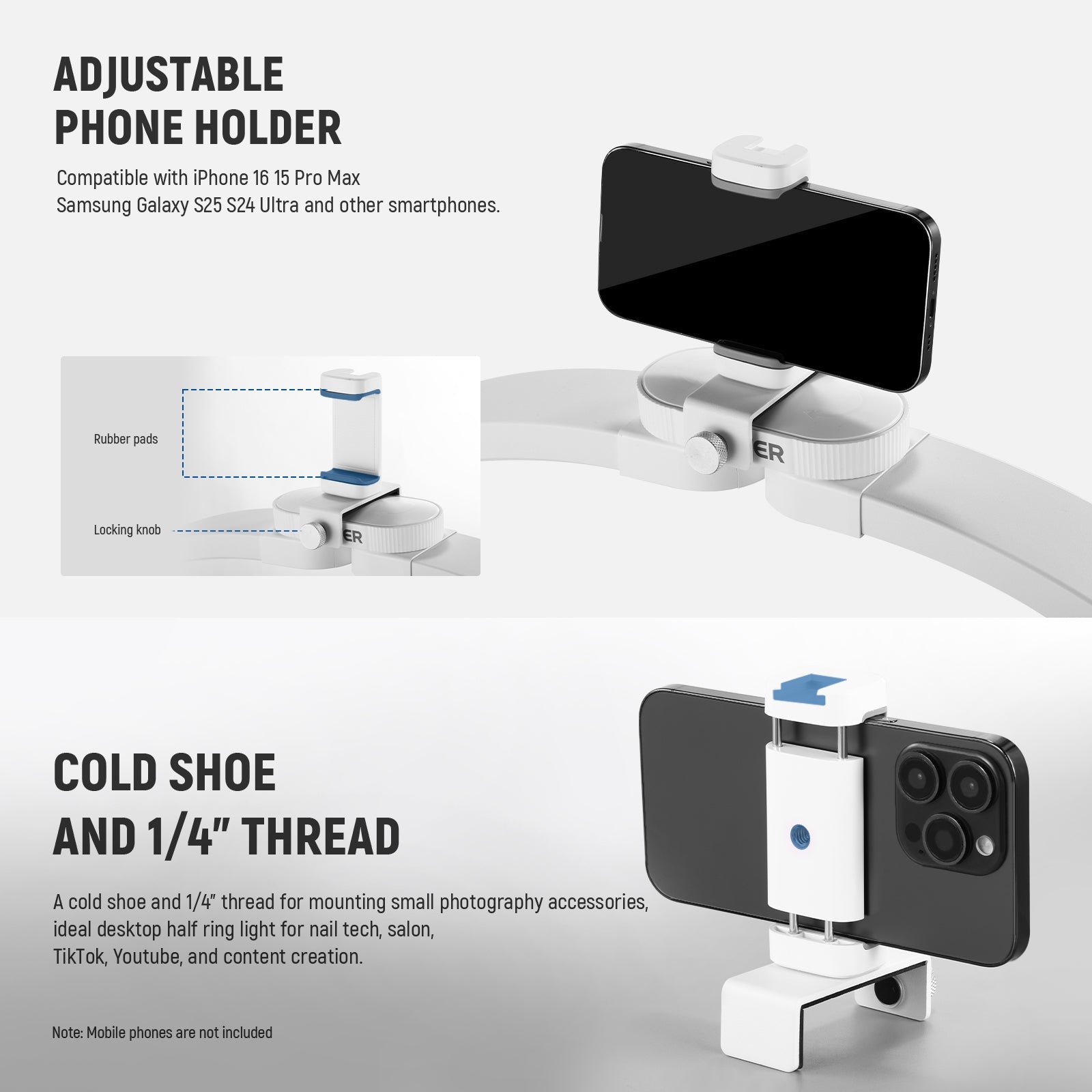 - Soporte ajustable para teléfono : El soporte para celular de este anillo de luz LED semicircular portátil NEEWER para escritorio es compatible con iPhone 16, 15 Pro Max, Samsung Galaxy S25, S24 Ultra y otros smartphones. Se fija a la lámpara con una perilla de bloqueo y cuenta con almohadillas de goma para evitar rayones. Incluye zapata fría y rosca de 1/4" para montar pequeños accesorios de fotografía. Ideal para selfis, fotos y grabación de video para compartir en redes sociales, como YouTube y TikTok.