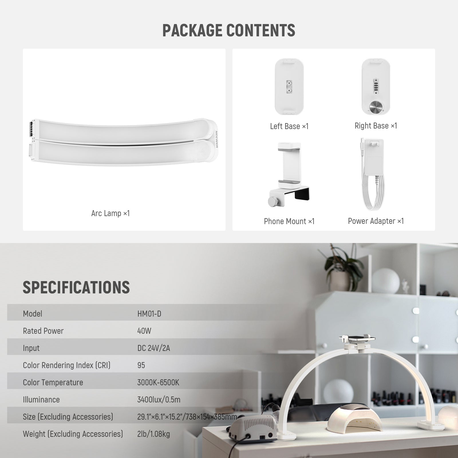 - Lámpara de arco LED plegable de 73 cm : Esta lámpara LED de escritorio bicolor de 73 cm, regulable y con brazo para manicura, ofrece una potencia de 40 W, un rango de temperatura de color de 3000 K a 6500 K, una iluminancia máxima de 3400 lux/0,5 m y un CRI de 95 para una reproducción precisa del color. Su diseño plegable en forma de media luna facilita su almacenamiento y transporte, ideal para maquilladores y creadores de contenido en movimiento.