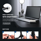 - Soporte para teléfono incluido : el anillo de luz de escritorio viene con un accesorio de soporte para teléfono ajustable de 2,4" a 3,7"/ 6 a 9,5 cm, compatible con iPhone 16, 15 Pro Max Plus, 14, 13 Mini, Samsung Galaxy S24, S23, S22 Ultra, Google Pixel 9, 8, 7 Pro, Huawei y otros teléfonos inteligentes. Ajuste fácilmente el soporte para teléfono en la varilla telescópica del soporte de luz de anillo para selfies de mesa a la altura deseada y fíjelo en su lugar para cambiar sin problemas entre los modos de disparo vertical y horizontal.