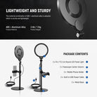 - Iluminación y altura ajustables : presione el botón de modo para alternar la temperatura de color de 3000k, 3500k, 4400k, 5600k a 6500k. Ajuste y controle el brillo de la luz circular del 10 % al 100 %. Proporciona luz principal o luz de relleno para fotografía, videografía y sesiones de fotos. Ajústelo a su altura preferida a través de la varilla central telescópica mientras que la base de metal lo mantiene estable sin ocupar demasiado espacio, ideal para esteticistas, maquilladores, transmisores de redes sociales o creadores de contenido