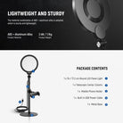 - Columna central telescópica y base de metal con peso : simplemente gire el anillo de ajuste para extender la columna central telescópica y elevar la luz de escritorio de 23,5"/596 mm a 33,1"/840 mm, y el soporte incorporado debajo de la luz para selfies permite un ajuste frontal y posterior de 105°. La base de metal con peso proporciona mayor estabilidad, lo que brinda tranquilidad al ajustar la configuración de iluminación para una mayor flexibilidad.