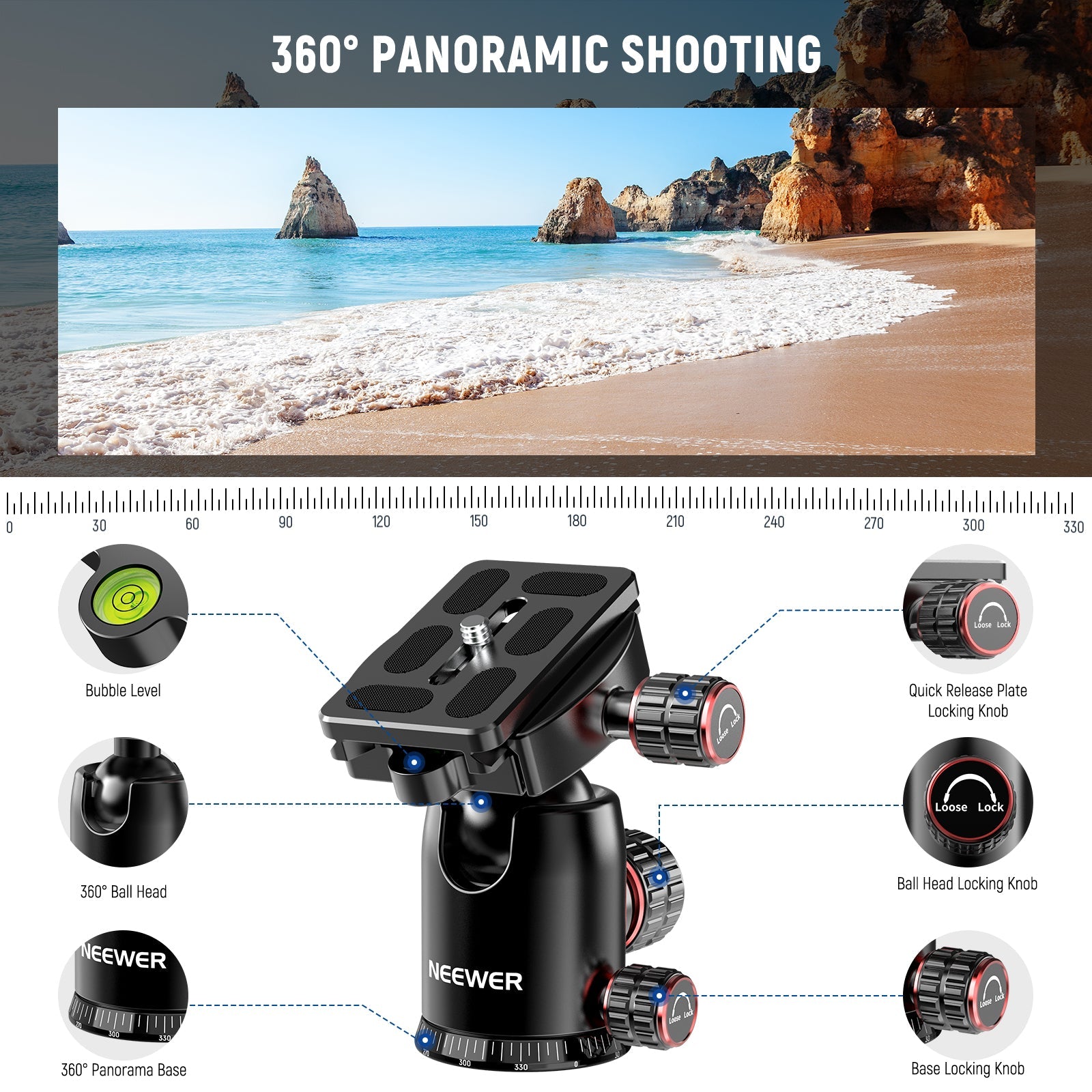 - 360° Ball Head & Arca Type QR Plate(TP63)- Rotate the camera on the 360° scaled pan base or tilt it from +90° to -90°, with locking knobs for precise adjustments. The 1/4" Arca type quick release plate of this tripod stand is for mirrorless cameras (compatible with Sony Canon Nikon DSLRs), camcorders, projectors, telescopes, and sliders, ensuring transitions among devices with an identical supporting system, with a handle and a bubble level for easy use as photography videography accessories