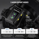 - Grabación independiente con 4 GB de almacenamiento : Cada transmisor con 4 GB de almacenamiento funciona también como un bolígrafo grabador para guardar hasta 9 horas de archivos de audio WAV de 48 KHz sin comprimir (hasta 30 min cada uno) y admite ganancia de decibelios (dB) con un solo toque. La baja frecuencia garantiza una grabación de voz precisa y cálida. La pantalla LCD muestra los modos de exportación, el volumen, el nivel de batería, el estado de la conexión, la cancelación de ruido y otra información. 3 modos de exportación de audio disponibles: Mono, Estéreo y Ms.