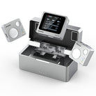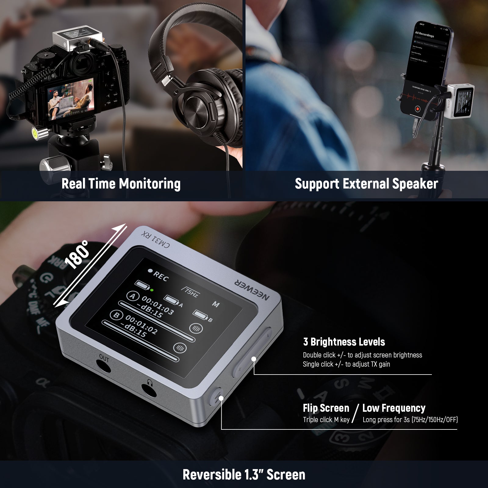 - Pantalla LCD reversible fácil de usar : El RX cuenta con una pantalla LCD de 1.3" que permite alternar entre interfaces para uno o dos dispositivos. Presione el botón "M" tres veces para girar la pantalla 180° y facilitar su uso a los videógrafos. Presione dos veces el botón de volumen para ajustar el brillo de la pantalla. Cuatro luces indicadoras en el TX le notifican el estado actual del dispositivo.