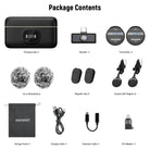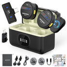 - Batería de 24 horas y carga fácil : El estuche de carga compacto cuenta con una pantalla HD que muestra el nivel de batería de los transmisores. Cada transmisor puede funcionar hasta 8 horas con el estuche de carga, lo que proporciona una batería de 24 horas. También puede usar el cable de carga para alimentar el transmisor directamente. También puede cargar su teléfono a través del puerto del RX, ideal para grabaciones de audio prolongadas sin interrupciones.