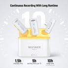 • 10 horas de duración de la batería : Ofrece hasta 10 horas de duración de la batería con el estuche de carga incluido. Un solo transmisor puede durar hasta 4 horas con una carga completa, y el estuche de carga ofrece 1,5 veces la carga. También puede usar el cable de carga para alimentar directamente el transmisor. No es necesario desconectar el receptor cuando el teléfono tenga poca batería. Disfrute de un acceso sin obstáculos para cargar su teléfono directamente a través de la interfaz tipo C del receptor.
