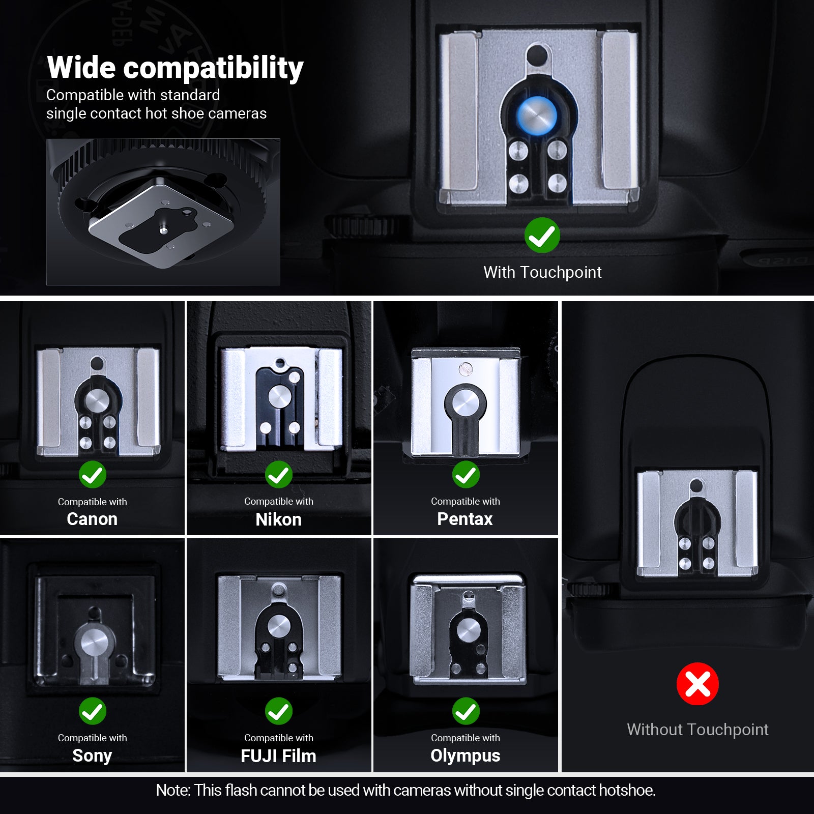 - Speedlight For Standard Hot Shoe Cameras- The single contact hot shoe speedlite flash for external photography lighting accessories is compatible with Canon Nikon Panasonic Olympus Pentax Fuji DSLR, compatible with Sony MI hot shoe cameras zv e10 zv1 a7iii a7iv a7c a7rv a6100 Alpha a6400 a6700. Not compatible with Canon EOS Rebel SL3/250D Rebel T7/1500D 2000D Rebel T100/3000D 4000D 200DII R50, not compatible with Sony A9III A99 A77 A350 ZV-1F, not compatible with Fujifilm X-A3 X100F X100T
