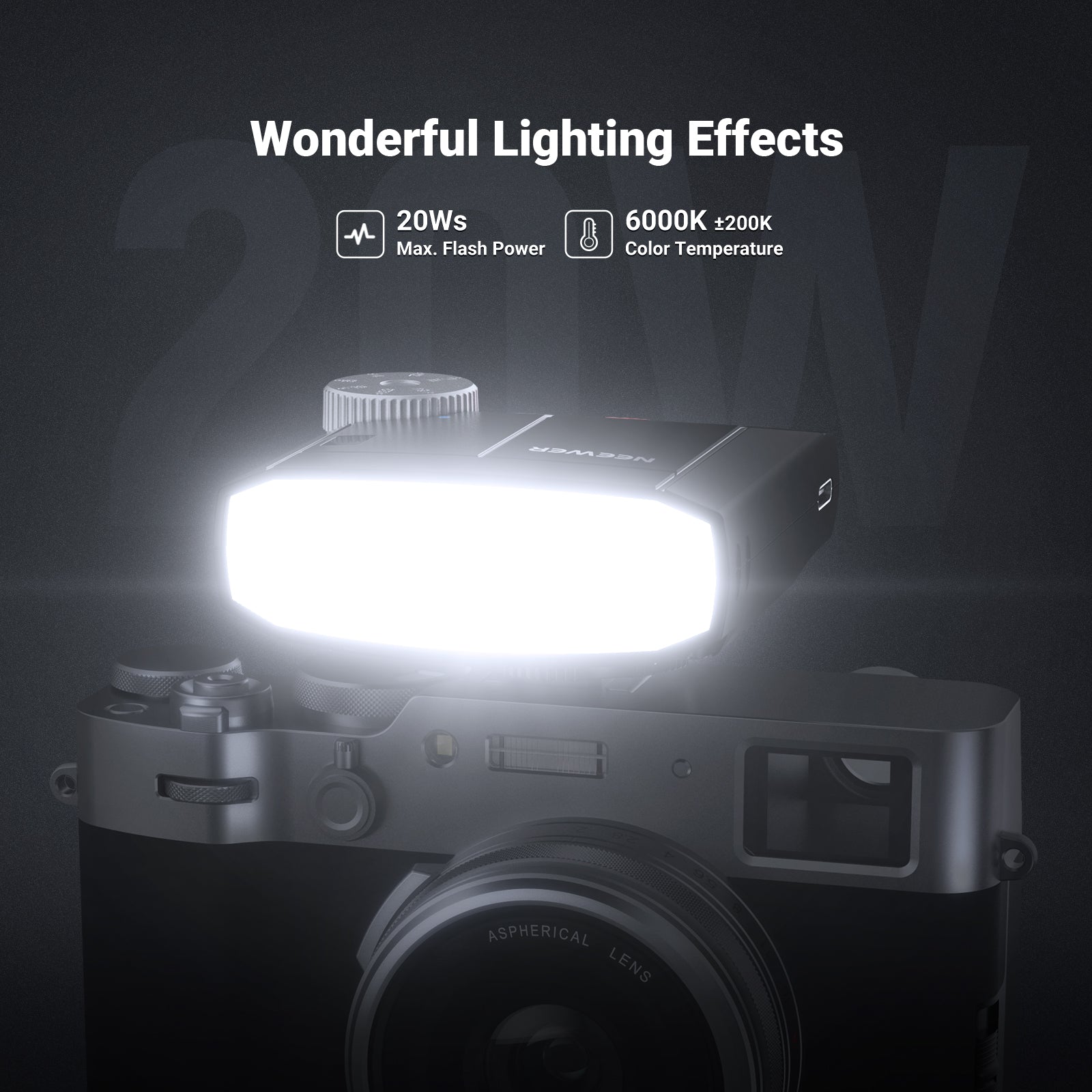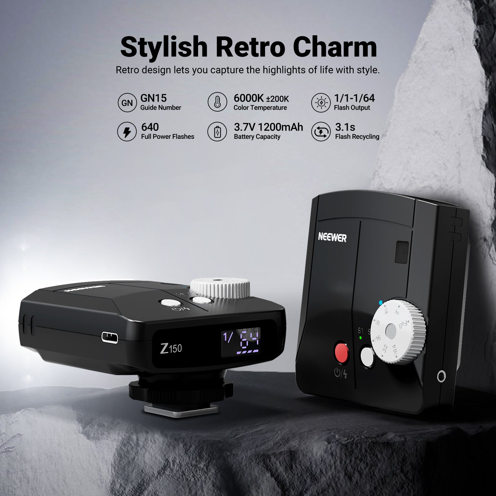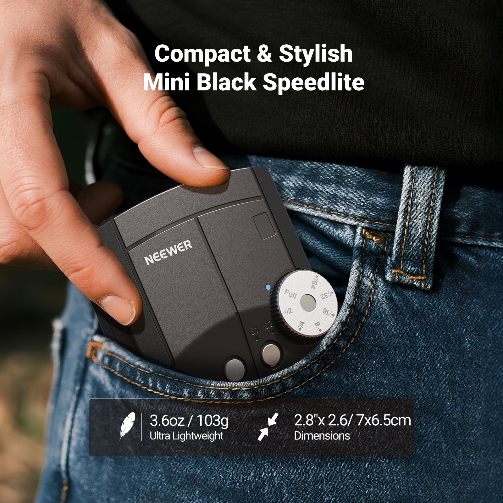 - Compact & Stylish Mini Black Speedlite- NEEWER Z150 is a lightweight (3.6oz/103g), retro style camera speedlite with a pocket sized form factor, more portable than studio strobe light equipment. Easily attach it to your camera for effortless street photography without fatigue. Its compact and vintage design complements your device, making it a content creator essential photoshoot light and influencer must have photo lighting gear for on the go photography