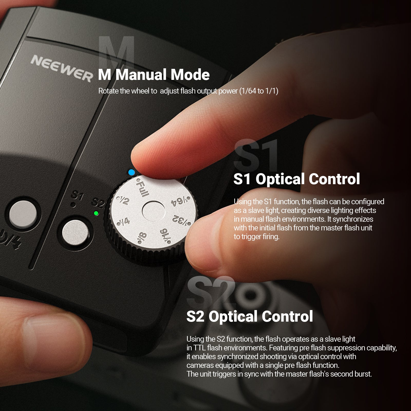 - Manual/S1/S2 Flash Modes- The off camera flash supports 3 triggering modes: Manual (M)/S1/S2. M mode lets you adjust flash output precisely from 1/64 to full power (1/1). S1 & S2 are optical slave modes available only in Manual mode for wireless triggering. S1 triggers the flash in sync with the first flash from the master unit, while S2 ignores preflashes and syncs with the second flash for TTL environments, ensuring seamless triggering