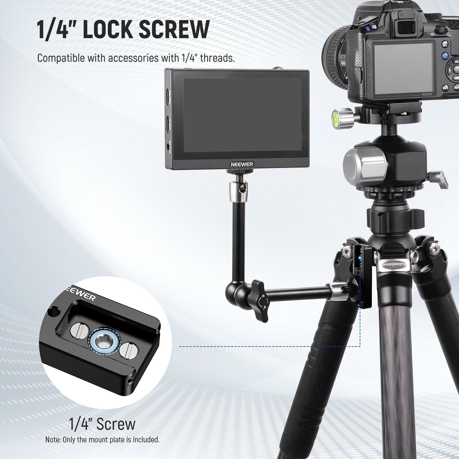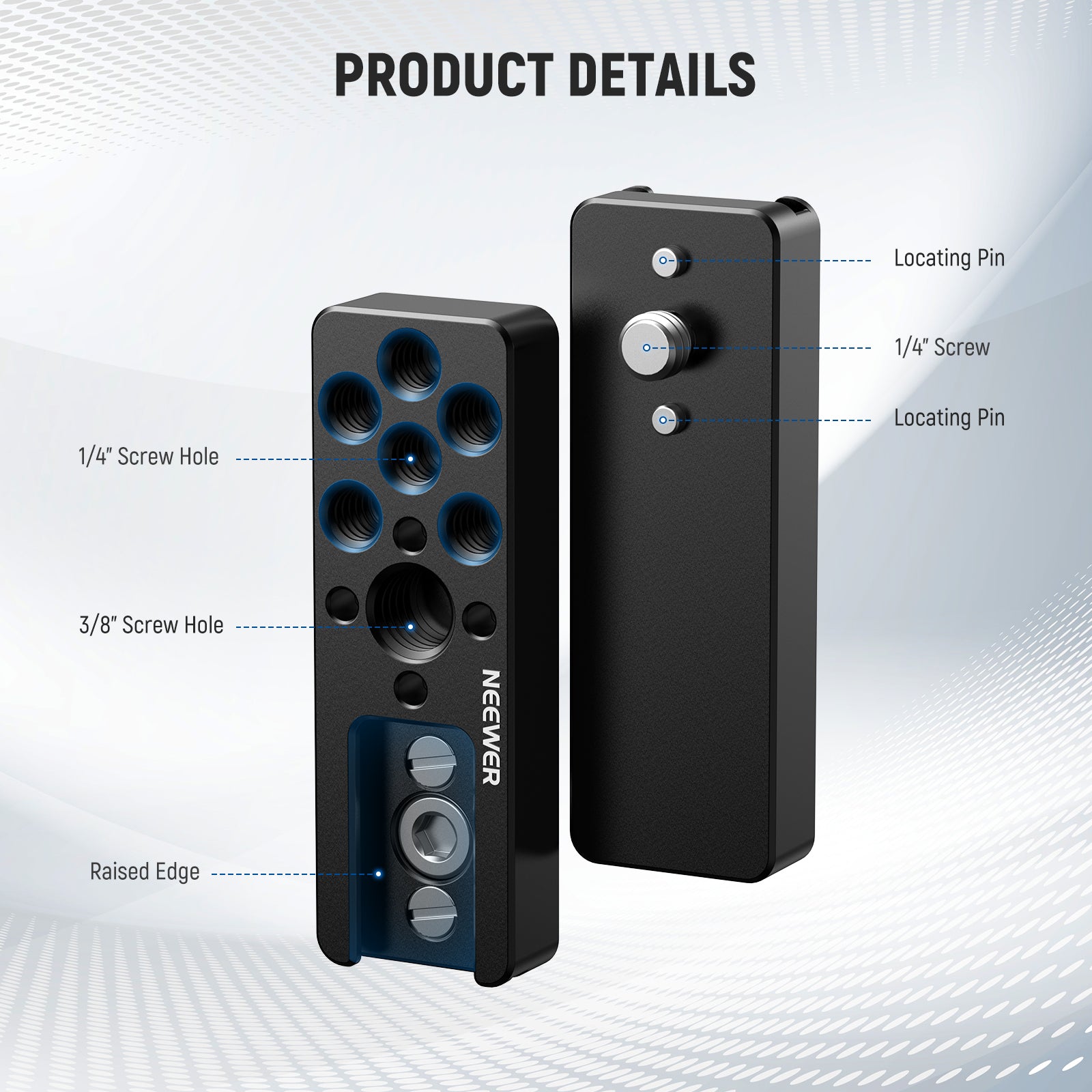 - Puntos de montaje de 1/4" y 3/8" : con múltiples roscas de 1/4" y 3/8", funciona como una placa de queso para cámara para placa de batería de montaje Mini V NEEWER PS001/PS005, placa adaptadora de batería PS004E NP-F , Brazo mágico ST21 con cabeza esférica, Brazo mágico UA010 con tornillo de localización ARRI de 3/8" y otros accesorios de fotografía