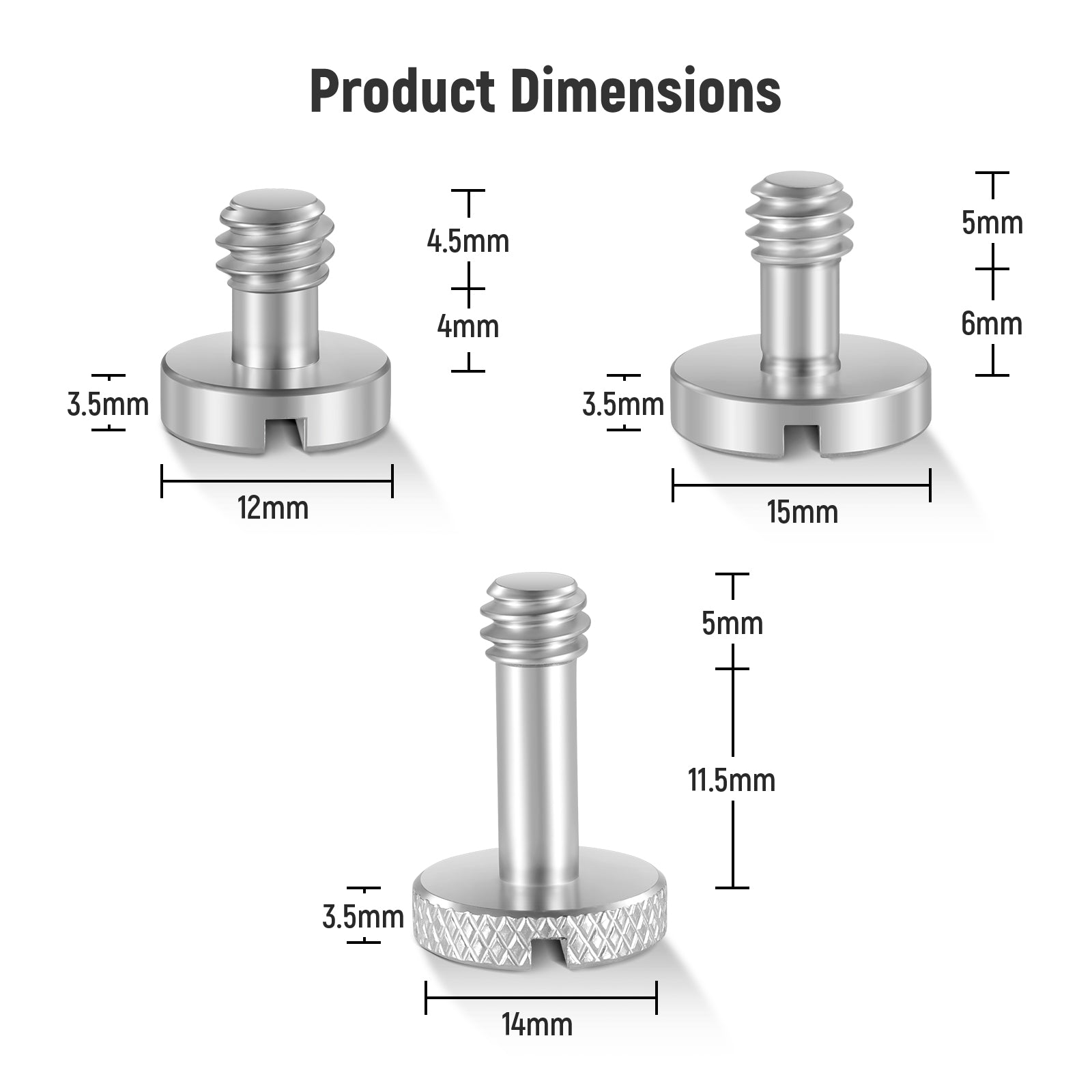 - Tornillo de repuesto de liberación rápida : monte de forma segura su cámara en la placa de liberación rápida con el kit de tornillos ranurados de 1/4". Los tornillos de 1/4" en 3 tamaños diferentes con 5 piezas cada uno incluyen 16,5 mm (5 mm roscados, 11,5 mm sin rosca), 11 mm (5 mm roscados, 6 mm sin rosca) y 8,5 mm (4,5 mm roscados, 5 mm sin rosca), para cualquier tamaño. y cantidad adicional para sus necesidades de liberación rápida