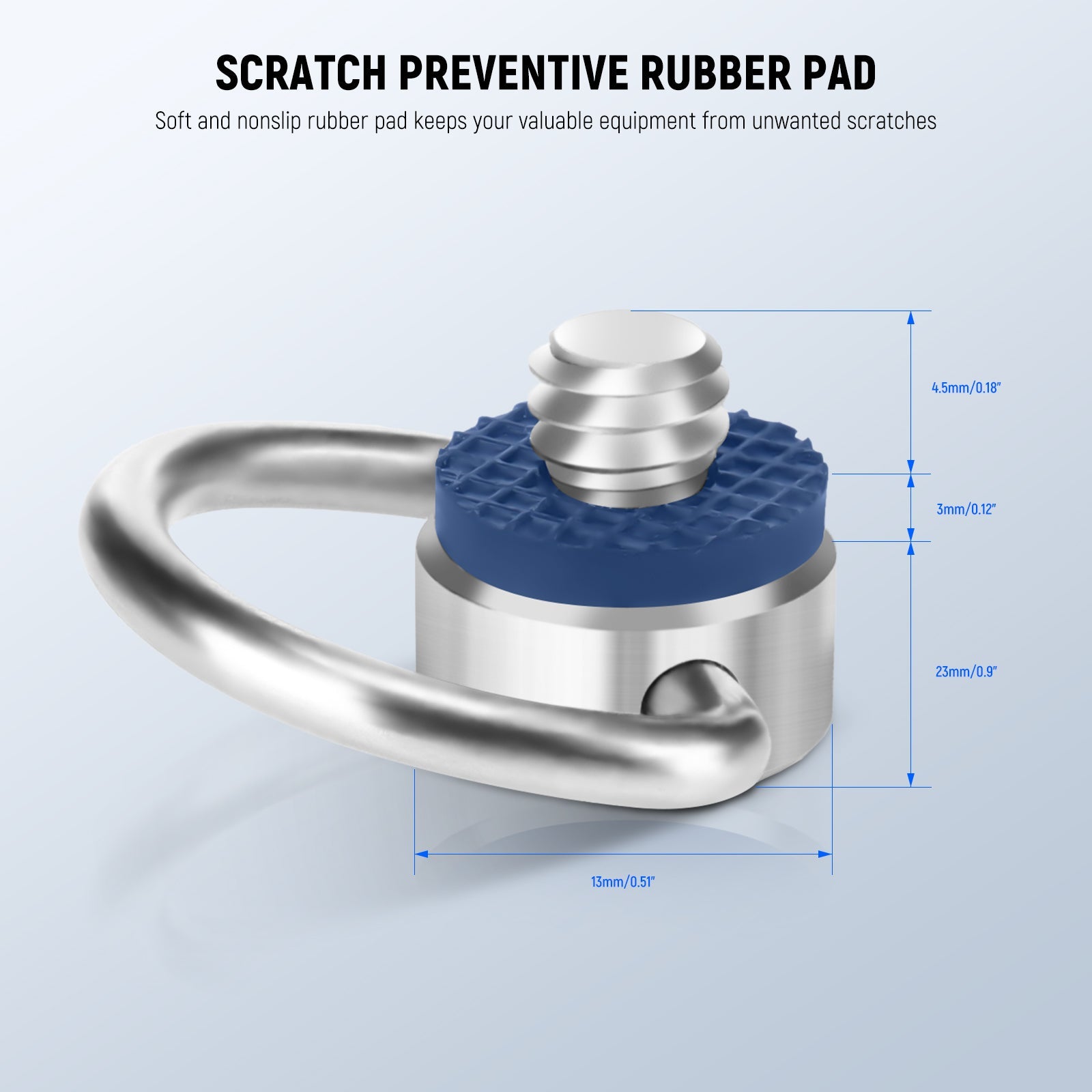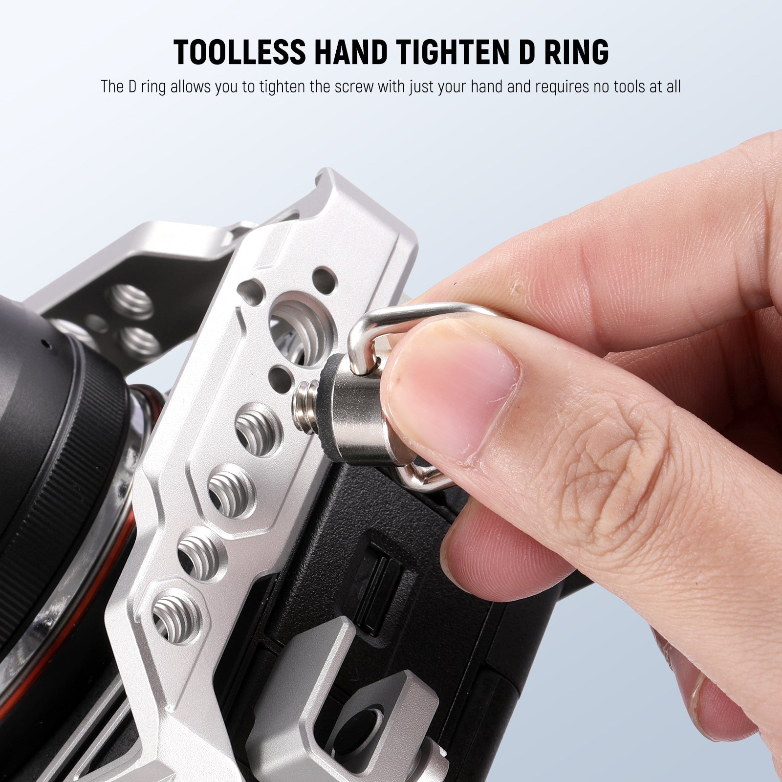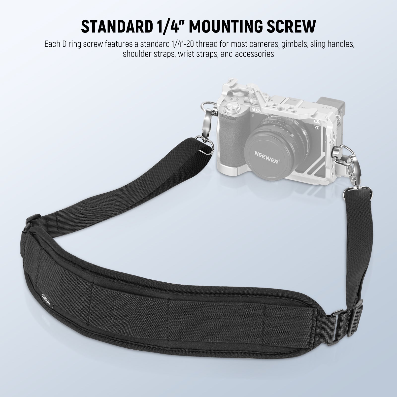 • Tornillo de montaje estándar de 1/4" : cada tornillo de anillo D tiene una rosca estándar de 1/4"-20 para la mayoría de cámaras, estabilizadores, asas tipo bandolera, correas de hombro, correas de muñeca y accesorios.