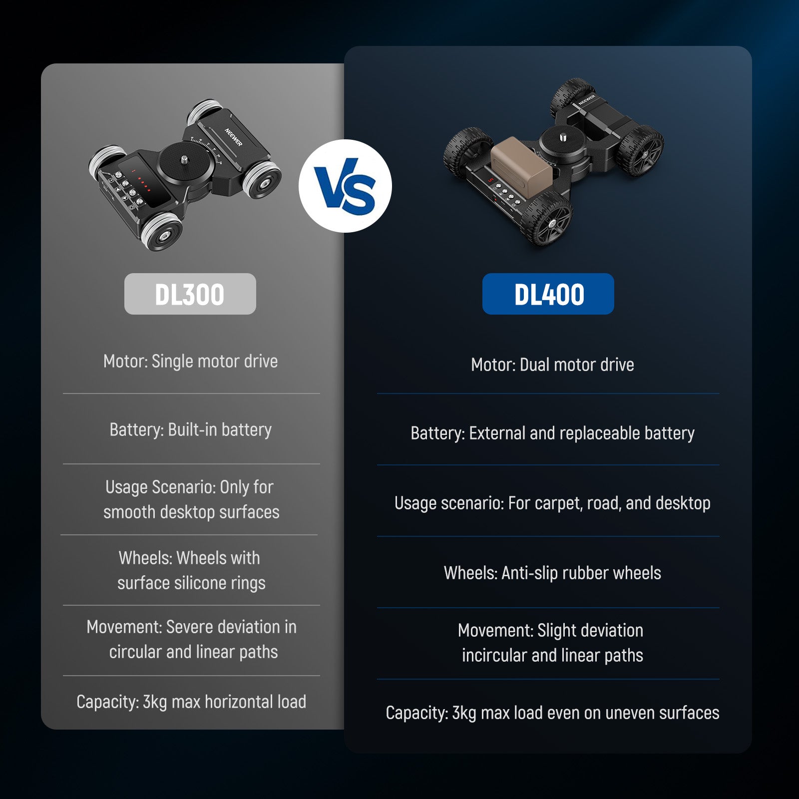 - Kit de carro deslizador motorizado mejorado para cámara : el carro deslizador motorizado para cámara DL400 se actualiza con un motor dual ultra silencioso y ruedas de goma antideslizantes con tracción en las dos ruedas delanteras, soporta hasta 6,6 lb/3 kg para un movimiento suave y una grabación de video ininterrumpida (por debajo de los 30 db). Agarre mejorado en la mayoría de las superficies, no solo en pisos y escritorios. El cabezal esférico de 360°, el soporte para teléfono y los accesorios del adaptador de cámara de acción están incluidos para el tornillo superior de 1/4". Compatible con cámaras vlog sin espejo Canon, Sony, Nikon, Fujifilm y Fuji