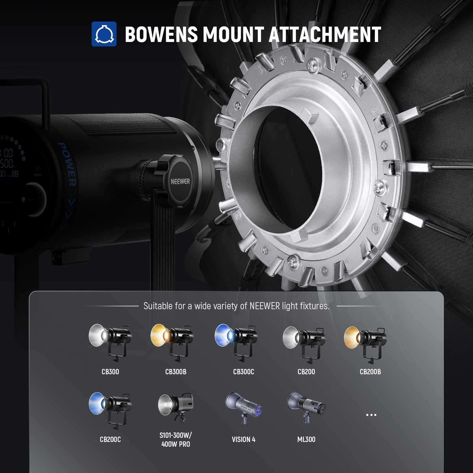 • Conexión mediante montura Bowens : al conectarse mediante montura Bowens, el softbox es compatible con Aputure 120d Godox sl60w NEEWER CB150, CB100, CB60, RGB CB60, SL-70W, S101-300W PRO, S101-400W PRO, Vision 4, Vision 5 y otras luces estroboscópicas de estudio y luces de video LED continuas con montura Bowens