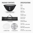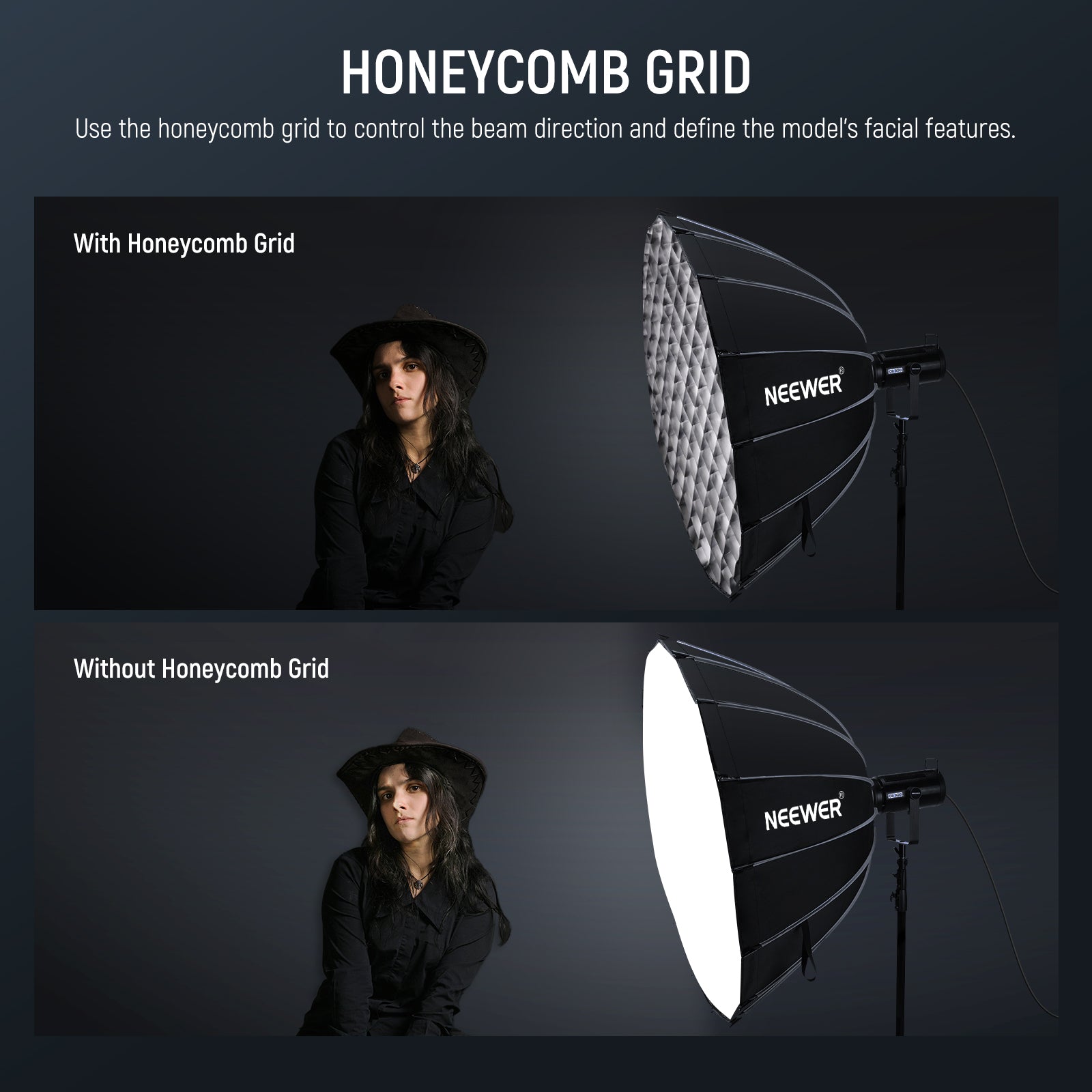 - Honeycomb Grid & Diffusers- The softbox lighting kit includes internal and external diffusers, which can be combined for an even softer and more diffused light. The honeycomb grid directs light at 45° and reduces spill, providing a distinctive soft yet punchy lighting effect that defines the model's facial structure