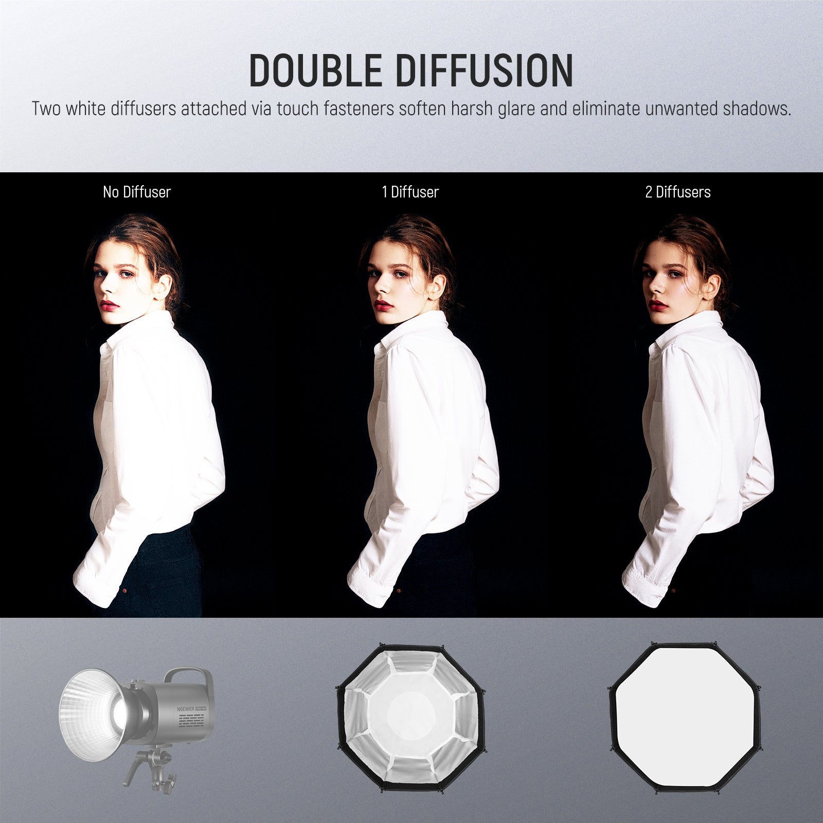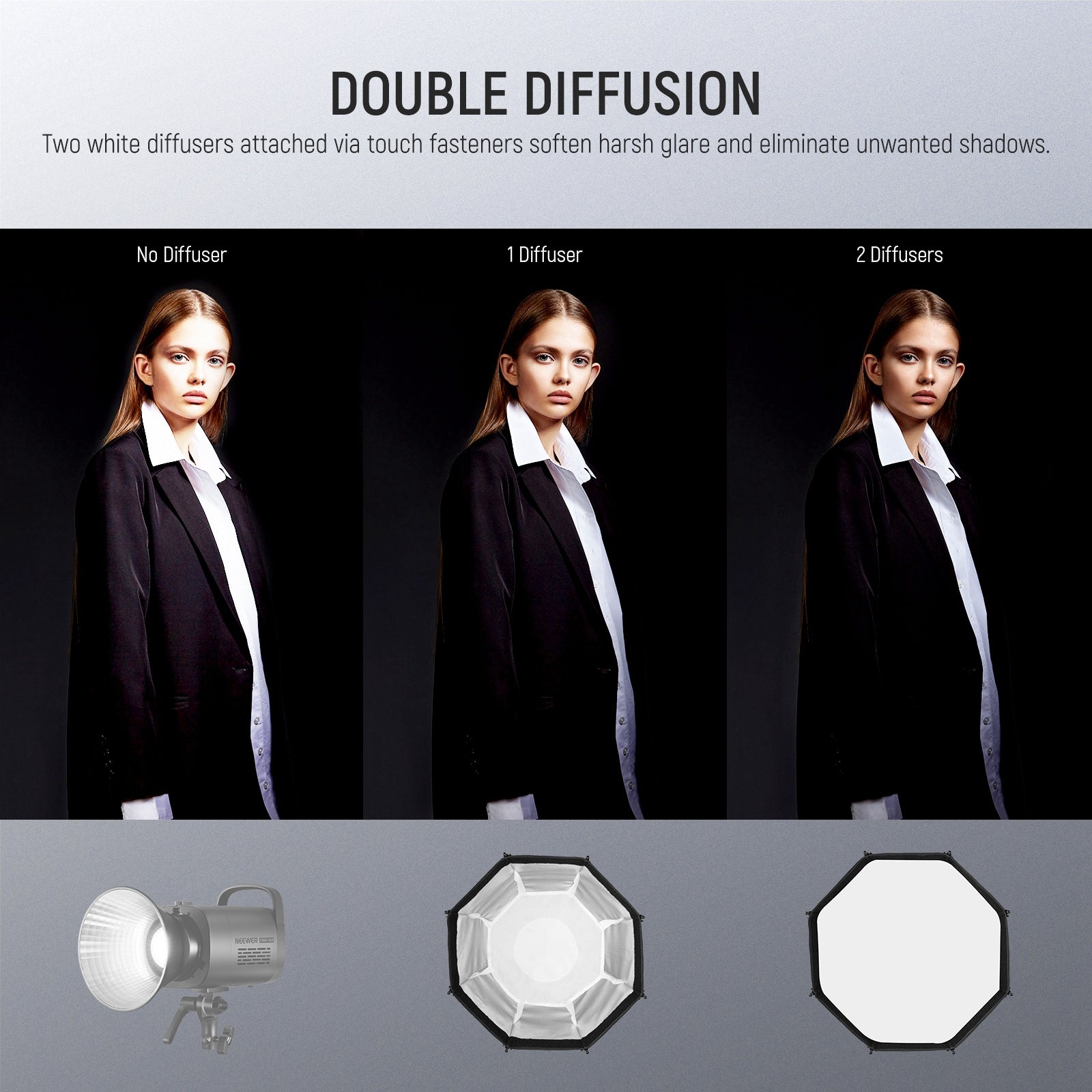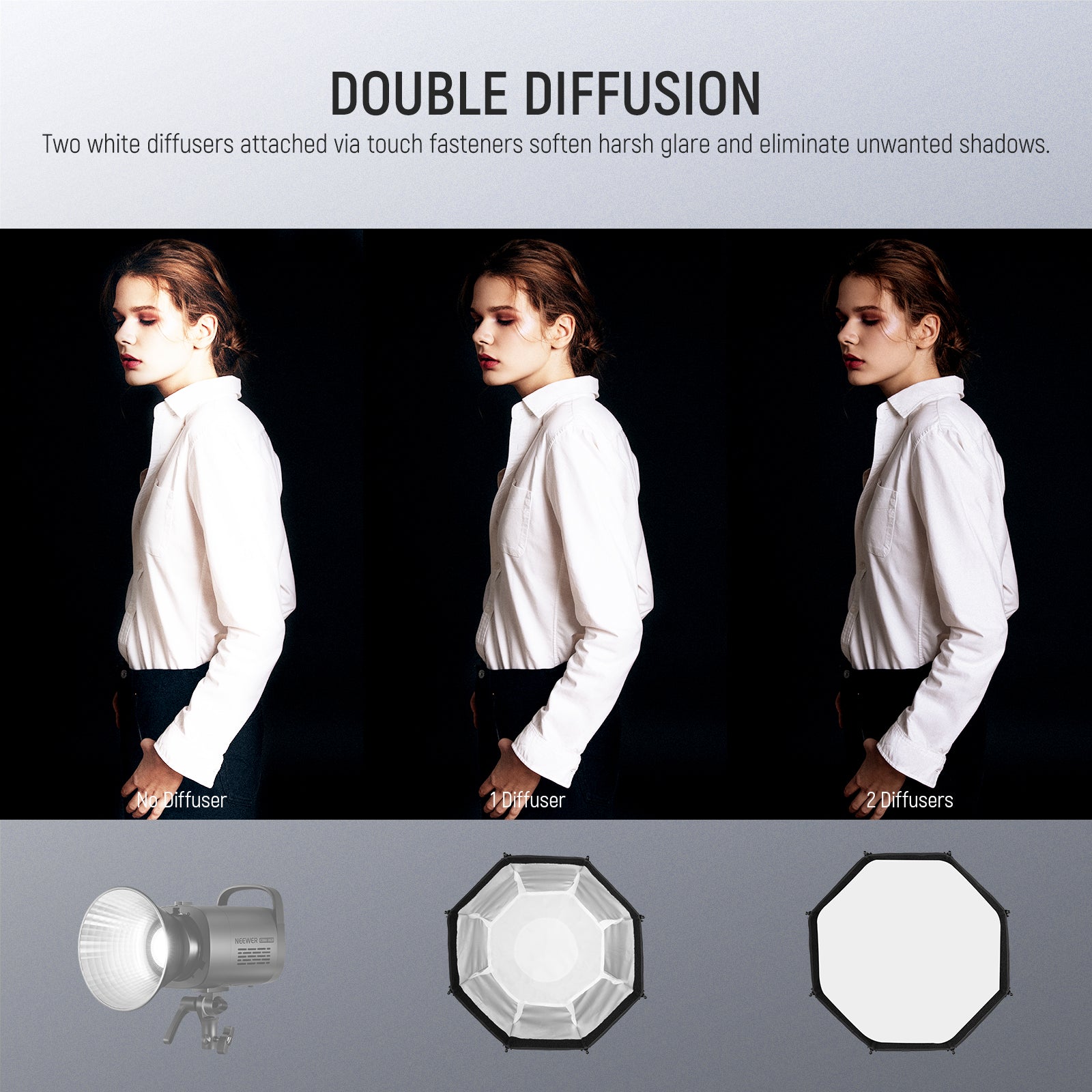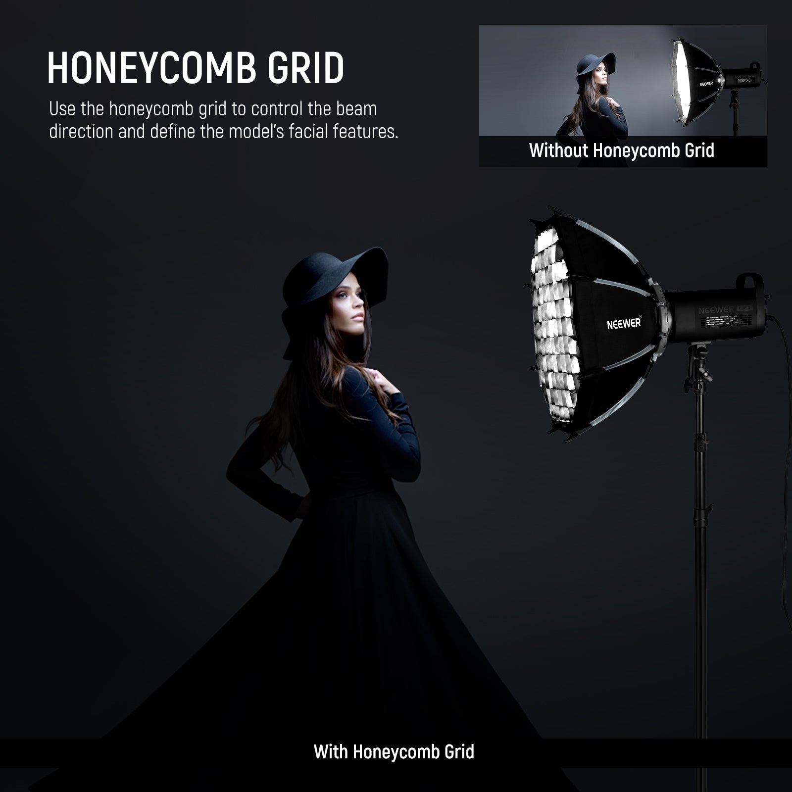 - Rejilla y difusores en forma de panal : la rejilla en forma de panal permite que la forma de la luz sea limitada y direccional, lo que genera un efecto de luz dramático y expresivo para definir la estructura facial de la modelo. Se pueden combinar dos difusores de calidad o usarlos por separado para lograr diferentes efectos.