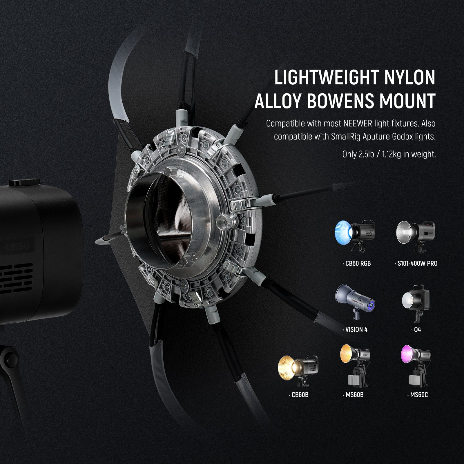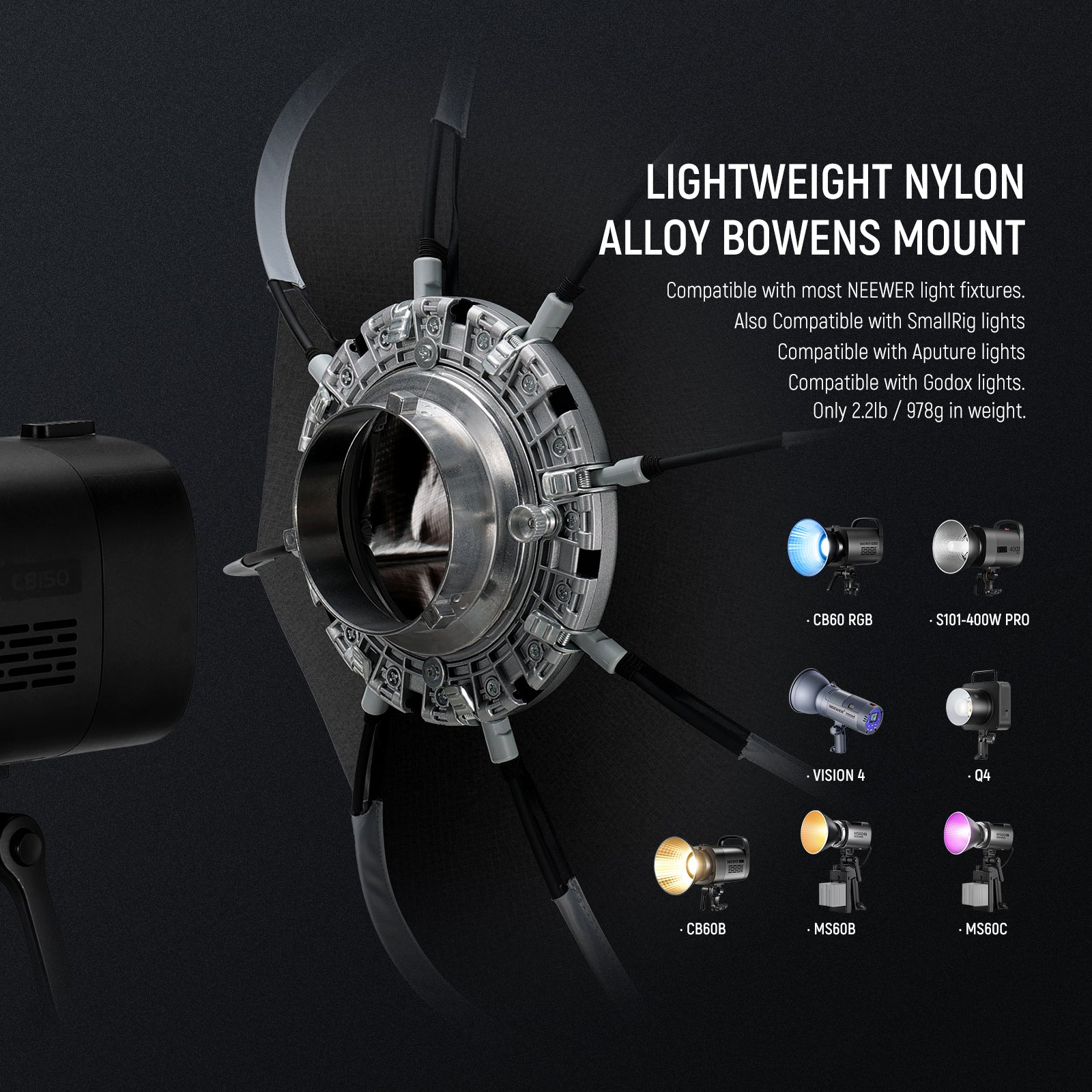 - Montura Bowens estándar : con la montura Bowens estándar, esta caja de luz se puede conectar a numerosos flashes monofónicos y luces de video continuas NEEWER y flashes monofónicos estroboscópicos, como CB60, CB100, CB150, CB60B, RGB CB60, CB200B, MS60B, MS60C, MS150B, S101-300W/400W Pro, Vision 4, Q4. Compatible con SmallRig compatible con Aputure 120d Godox sl60w, etc.