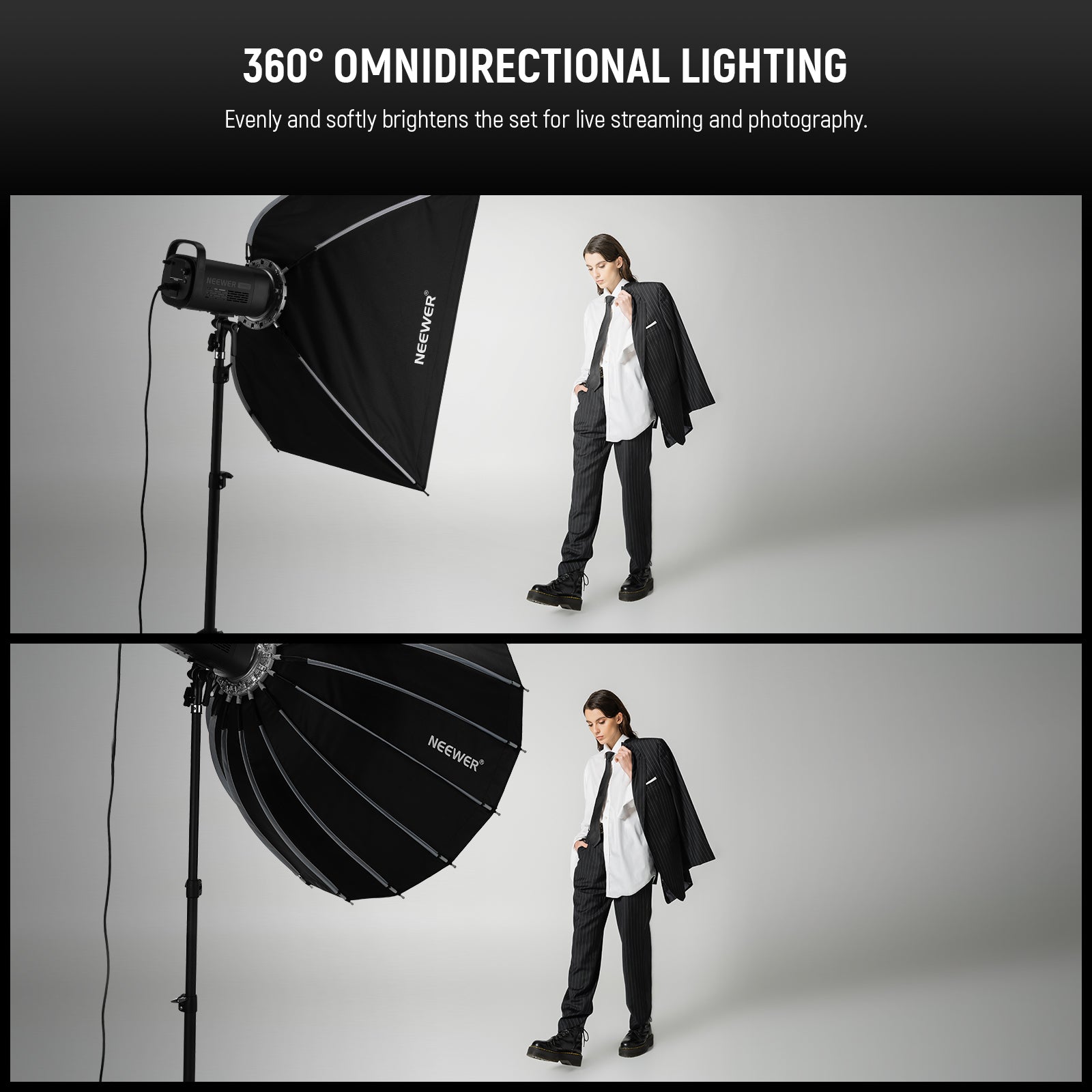 - Softbox parabólico profesional : este softbox parabólico profundo tiene una abertura de 55 x 41 cm (21,7 x 16,1 in) con un revestimiento interno plateado suave y uniforme sobre la tela de nailon engrosada que amplía, difunde y suaviza la luz mientras conserva la reproducción de color original. Incluye dos capas de difusores de luz y una rejilla en forma de panal para una salida óptima