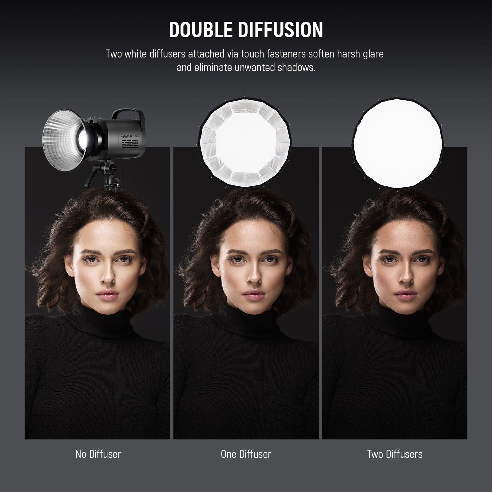 - Rejilla y difusores en forma de panal : los difusores internos y externos se pueden combinar para lograr una luz aún más suave y difusa, y se pueden fijar mediante cierres de contacto para facilitar el montaje. La rejilla en forma de panal dirige la luz a 45° y reduce la dispersión, lo que proporciona un efecto de iluminación suave pero llamativo que define la estructura facial de la modelo.