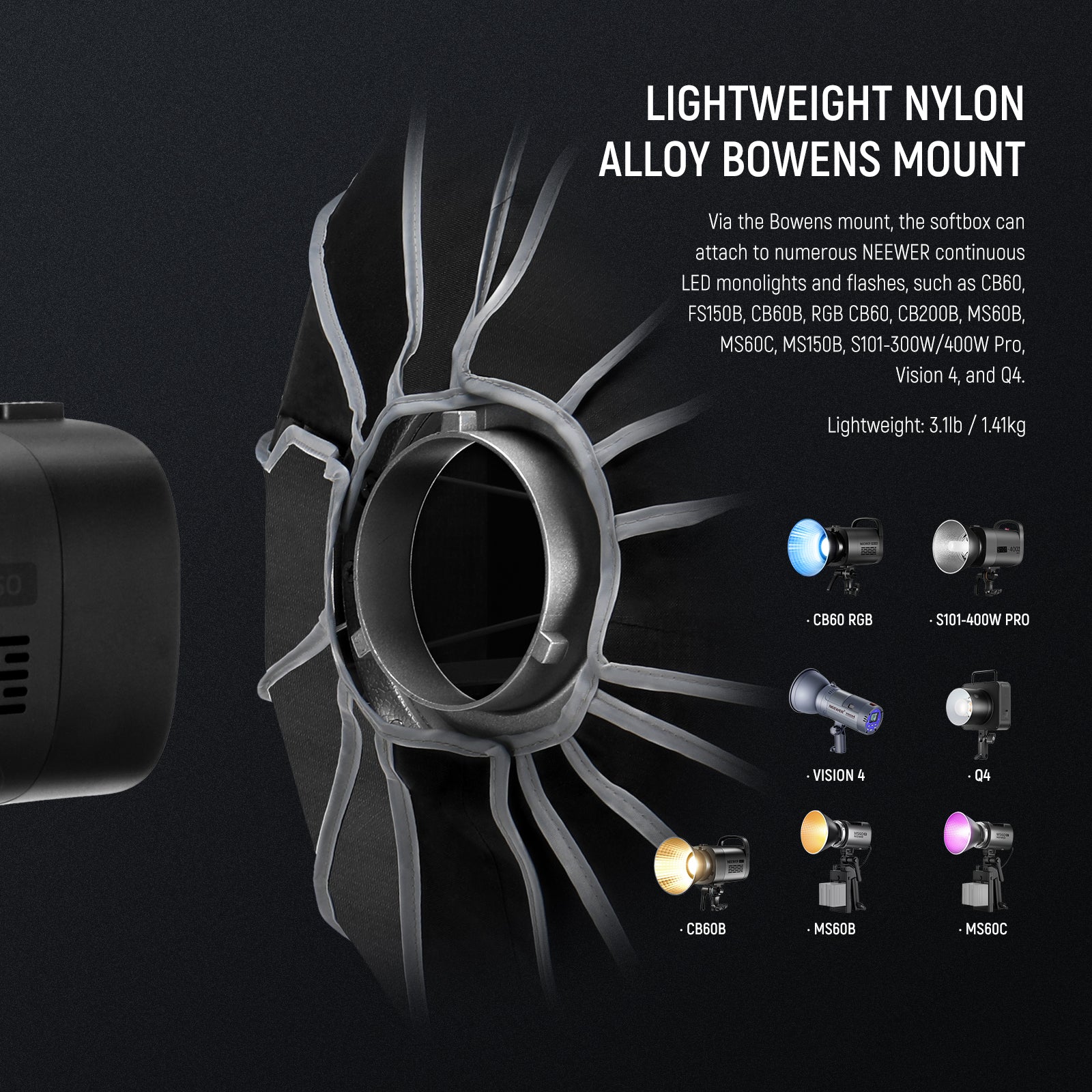 - Montura Bowens estándar : perfectamente compatible con Aputure 120d Godox sl60w NEEWER CB200B CB60 CB60B RGB CB60 MS150B MS60B MS60C Vision 4 S101-300WPRO/400W PRO y otras luces estroboscópicas de estudio y luces de video LED continuas con montura Bowens