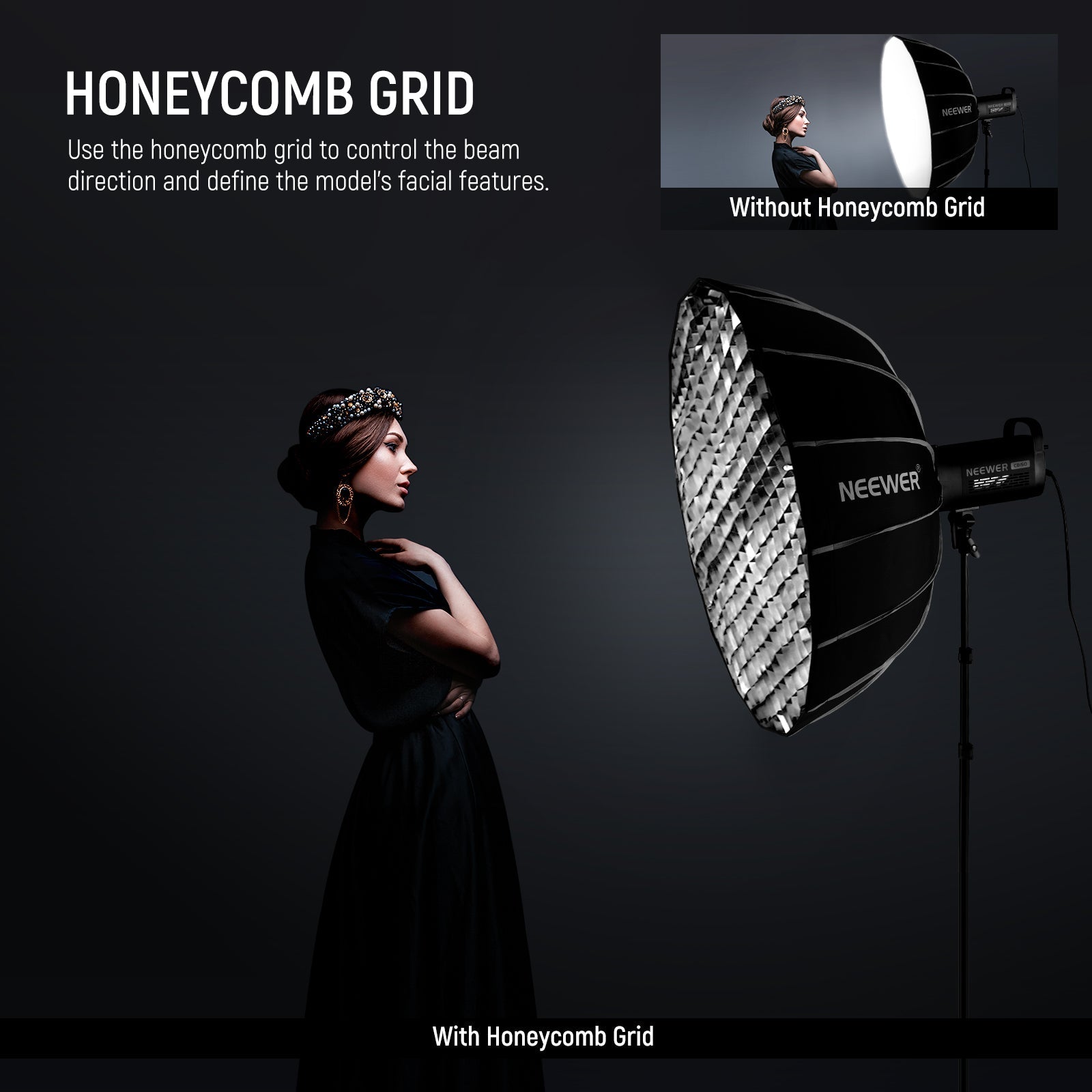 - Softbox parabólico hexagonal : este softbox parabólico profundo y plegable tiene una abertura de 85 x 39 cm (33,5 x 15,4 in) con un revestimiento interno plateado suave y uniforme sobre la tela de nailon engrosada que amplía, difunde y suaviza la luz al tiempo que conserva la reproducción del color original. Incluye un disco deflector, dos capas de difusores y una rejilla en forma de panal para una salida óptima