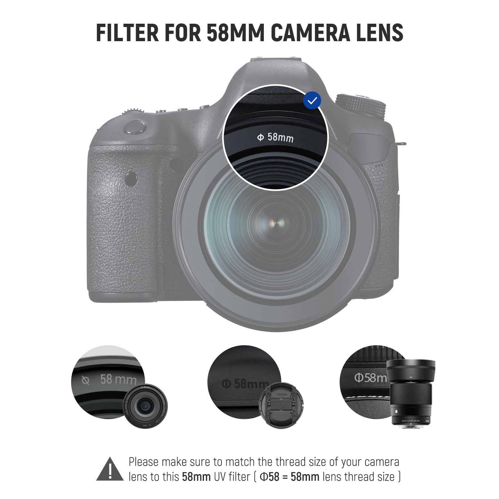 - Elija el tamaño de filtro correcto: esta gama de filtros UV HD viene en diferentes tamaños. Por ejemplo, el filtro de 58 mm solo puede funcionar con una lente de cámara de 58 mm. Asegúrese de hacer coincidir el tamaño de la rosca de la lente de su cámara con el filtro UV (Φ58 = tamaño de rosca de la lente de 58 mm). También se incluye un estuche de transporte para guardar el filtro de forma segura.