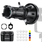 • Gobos con patrones enchufables y geles de color : los 16 gobos con patrones de metal permiten la proyección de formas y texturas sobre sujetos o fondos con el soporte de gobo, lo que mejora la creatividad con luces y sombras gráficas únicas. Mientras tanto, los 5 geles de color (amarillo, rojo, naranja, azul, verde) se pueden usar para ajustar la temperatura del color de la luz para efectos y acentos atmosféricos artísticos. Nota: los gobos tienen bordes afilados, manipúlelos con cuidado