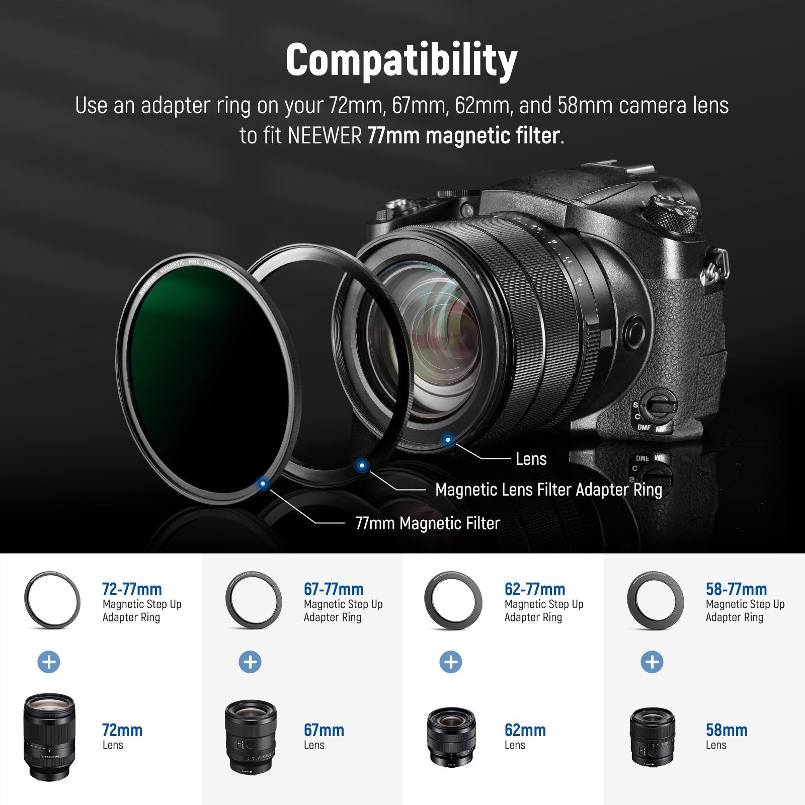 - Compatibilidad: obtenga este kit de anillo adaptador para que pueda usar la lente de su cámara de 72 mm, 67 mm, 62 mm y 58 mm con su filtro magnético de 67 mm/72 mm/77 mm.