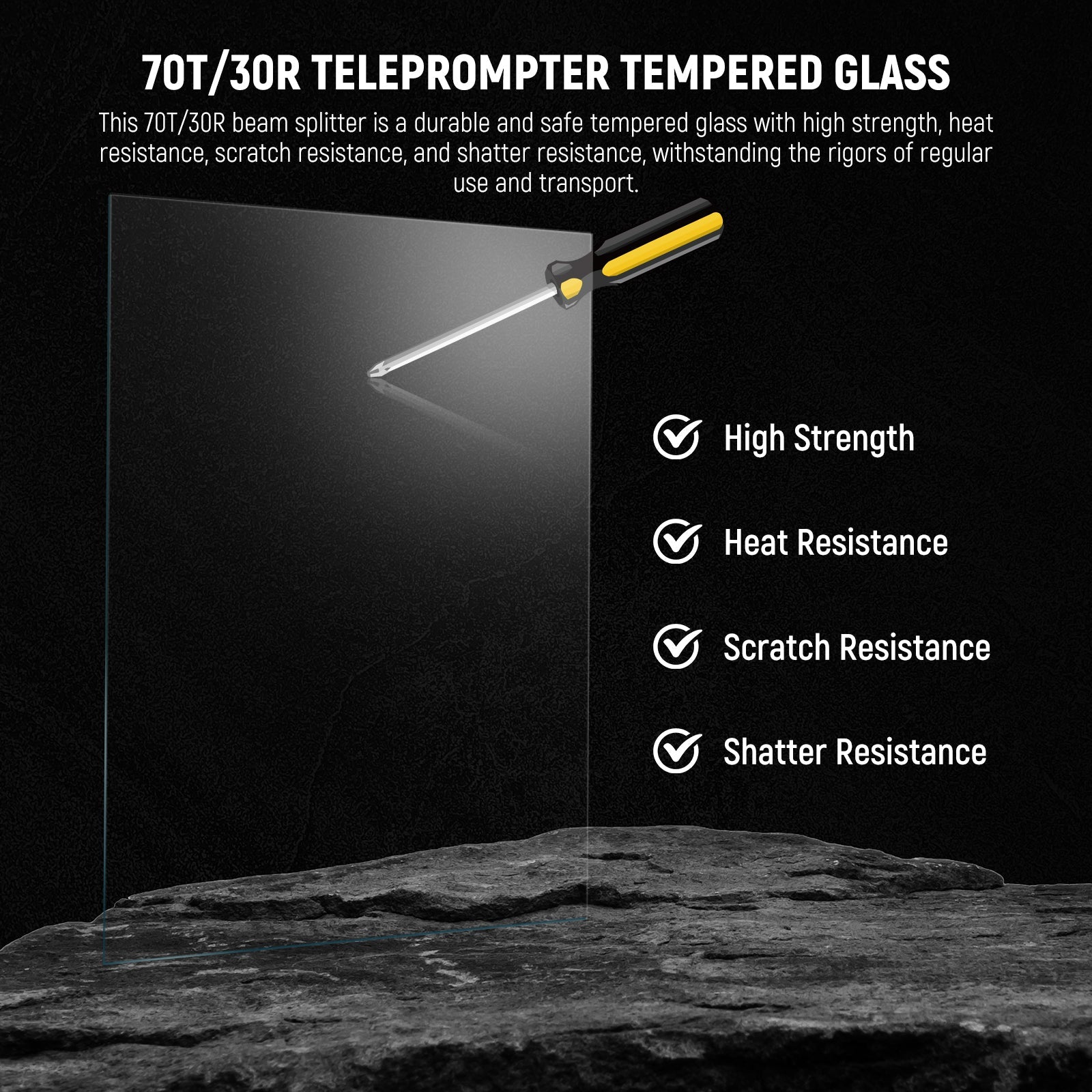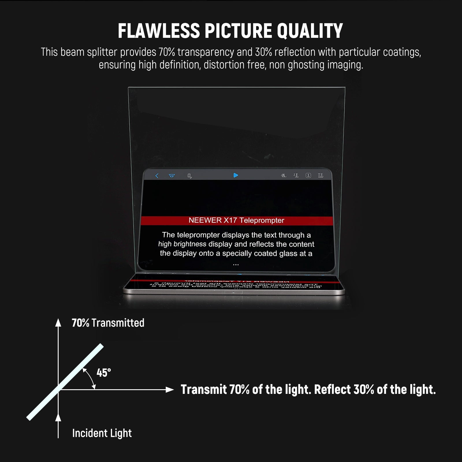 - Calidad de imagen impecable : este divisor de haz proporciona un 70 % de transparencia y un 30 % de reflexión con recubrimientos particulares, lo que garantiza imágenes de alta definición, sin distorsiones y sin imágenes fantasma. El revestimiento antirreflectante también garantiza que el vidrio mantenga su color neutro para preservar los verdaderos colores de su contenido, lo que lo hace perfecto para teleprompting.