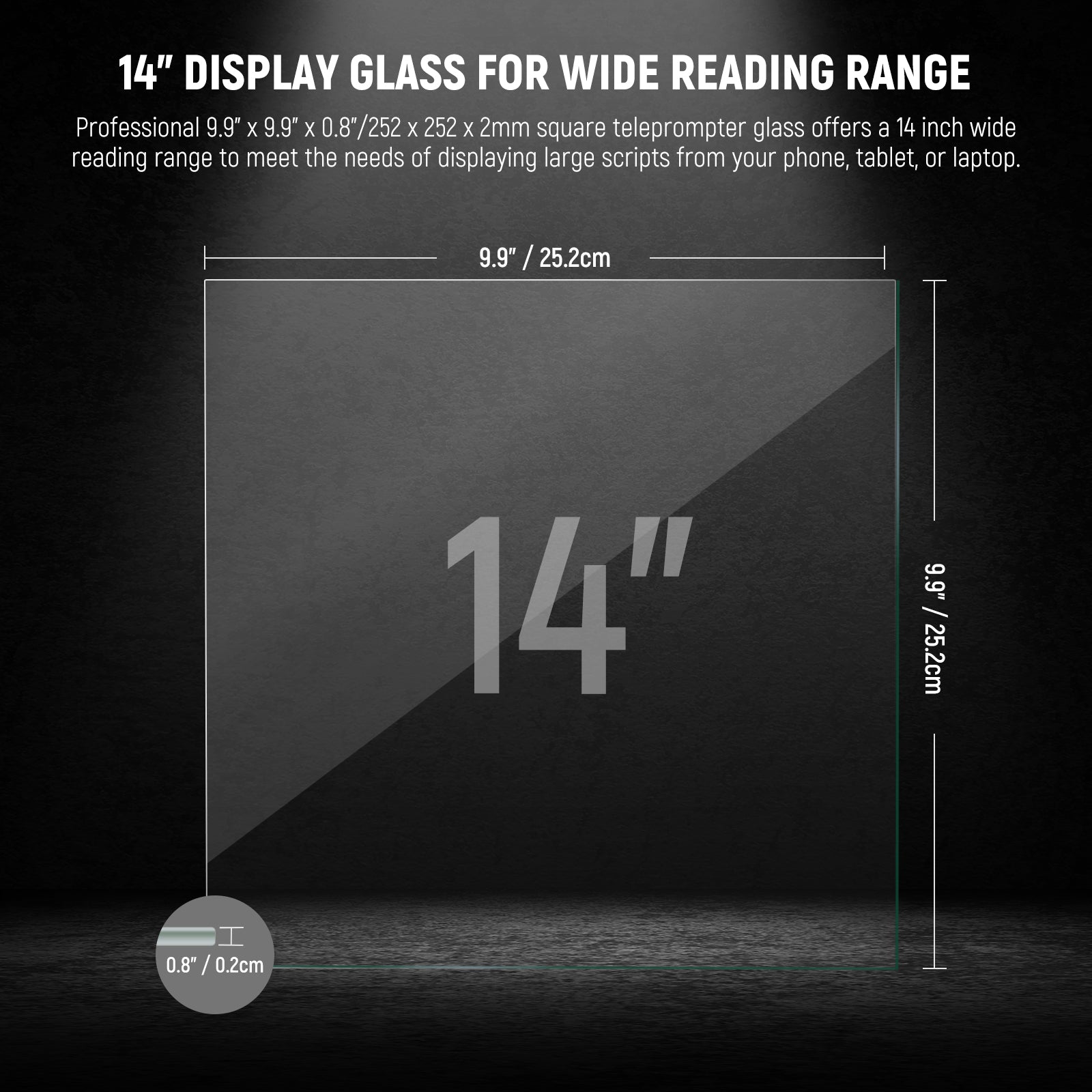 - Cristal de pantalla de 14 pulgadas para un amplio rango de lectura : el cristal de teleprompter cubo profesional NEEWER de 9,9" x 9,9" x 0,8"/252 x 252 x 2 mm ofrece un amplio rango de lectura de 14 pulgadas para satisfacer las necesidades de visualización de guiones grandes desde su teléfono, tableta o computadora portátil