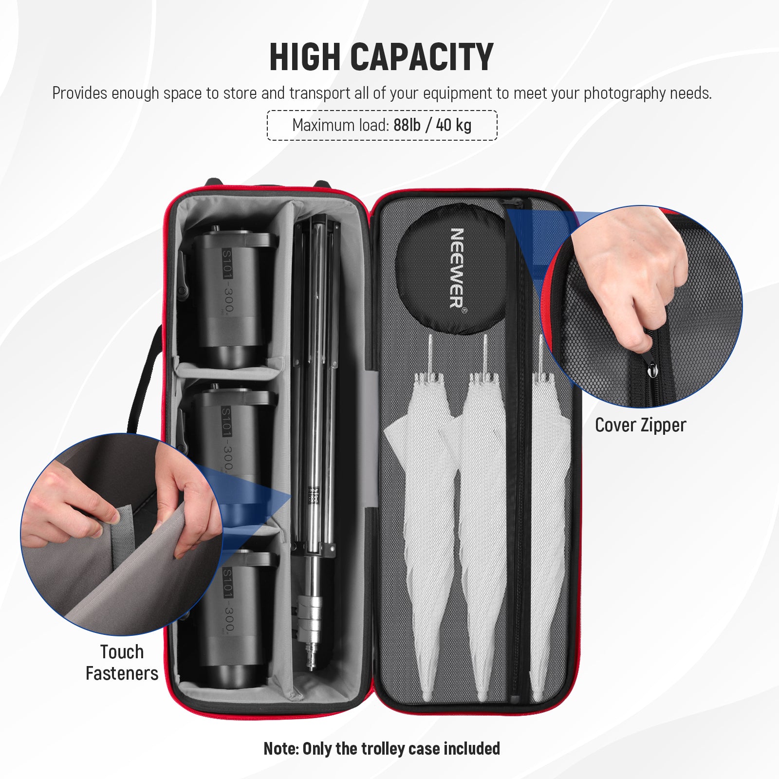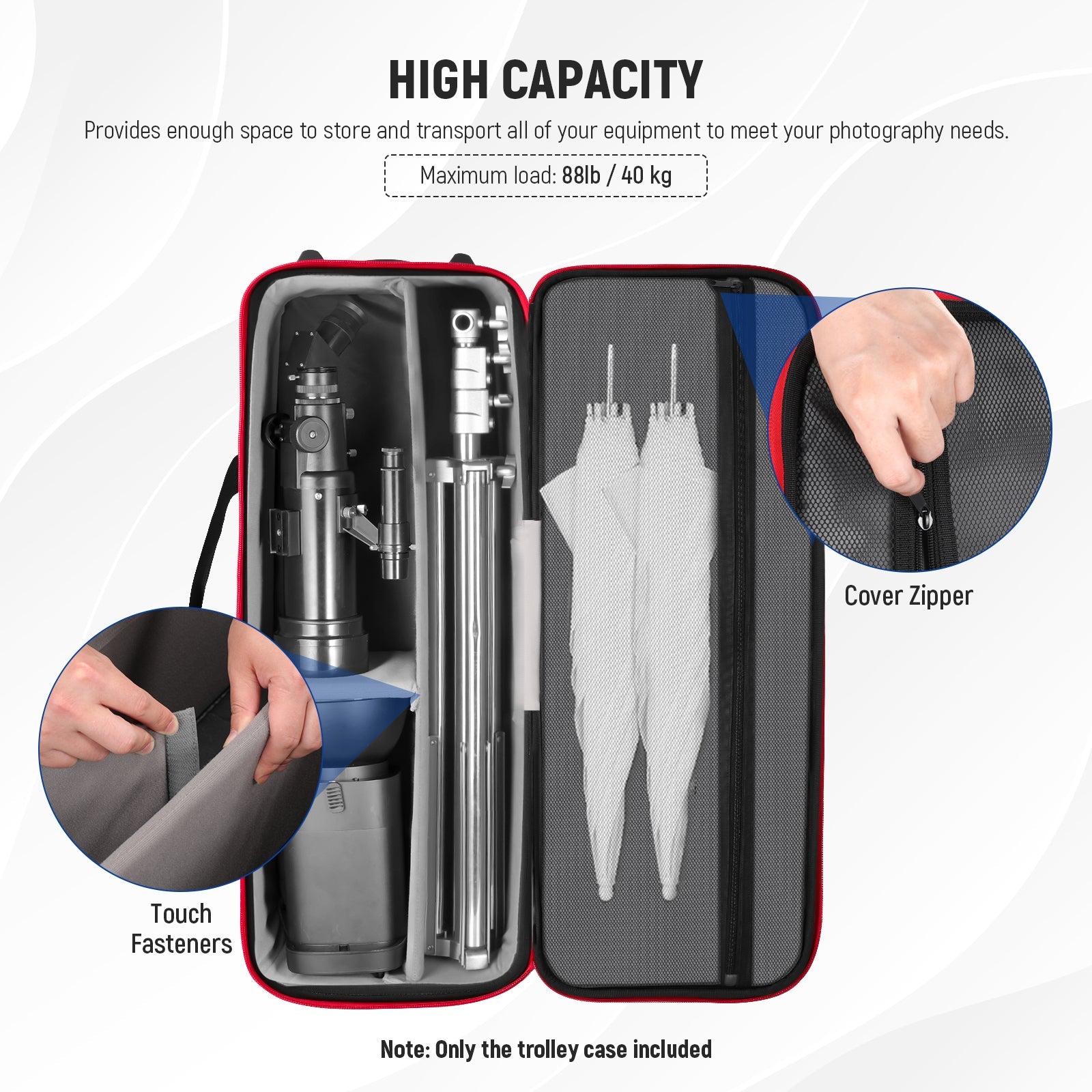 - Bolsa con ruedas de gran capacidad : el espacioso compartimento principal de 75 x 25 x 24 cm (29,5 x 9,8 x 9,4 pulgadas) puede albergar diversos equipos y accesorios de fotografía, desde telescopios, monolights, luces de vídeo LED, trípodes hasta micrófonos y filtros. La capacidad máxima de carga es de 40 kg (88 lb), con suaves cojines alrededor del compartimento para una protección completa.