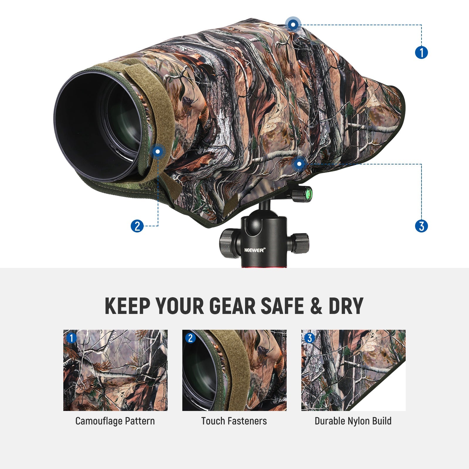 - Diseño de camuflaje de doble cara : esta cubierta de lluvia de camuflaje para lentes de cámara ayuda a los fotógrafos de vida silvestre a mezclarse con el entorno para tomar fotografías naturales sin interrupciones. Su diseño reversible les permite reaccionar rápidamente a los cambios climáticos o capturar momentos espontáneos sin demoras.