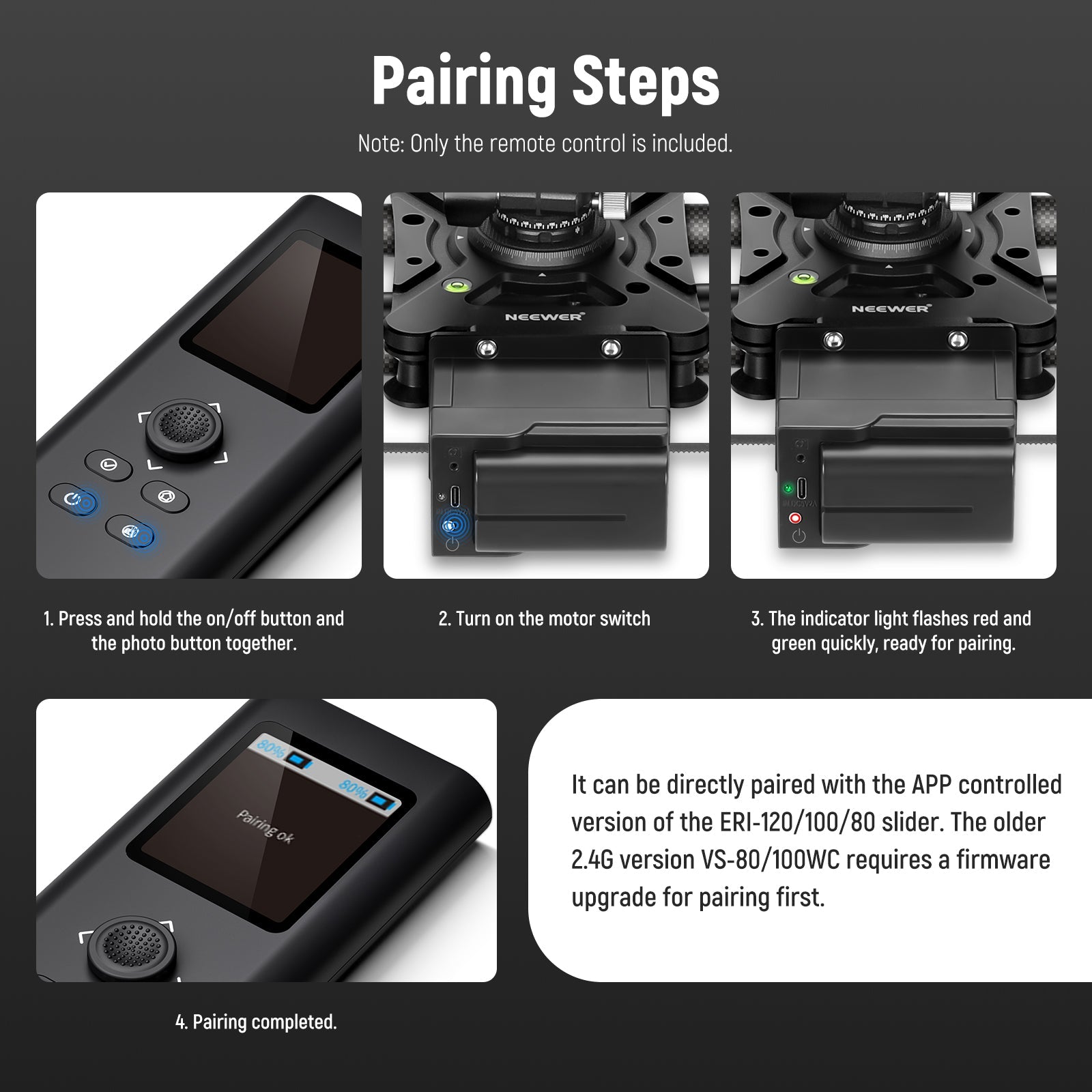 - Cómo actualizar la generación anterior de controles deslizantes para usar el control remoto: este control remoto de 2,4G puede funcionar con la generación anterior de controles deslizantes VS-80WC/VS-100WC de 2,4G, pero primero se requiere una actualización del firmware de los controles deslizantes antes de realizar el emparejamiento: Haga clic Actualice el firmware y el software, seleccione NEEWER 2.4G Wireless Motorized Camera Slider VS-80WC/VS-100WC para descargar el firmware en NEEWER y verifique el firmware para conocer el método de actualización. Instrucciones de actualización