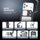 - 1 Click Installation & Full Access - Opened and locked via the side button, the phone cage needs no assembly and maintains full access to the camera, port, and buttons. A detachable rubber ensures seamless use of the Camera Control, and the hollow design is fully compatible with MagSafe wireless charging and magnetic accessories