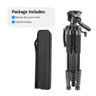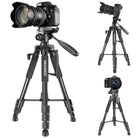 - El trípode cuenta con un cabezal giratorio de 3 posiciones con una placa de liberación rápida. Cuenta con un movimiento panorámico de 360 grados y le permite tomar fotografías en cualquier ángulo horizontal y verticalmente. Se pueden crear fácilmente panorámicas precisas.