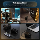 - Batería de montura V con múltiples puertos : Carga simultáneamente varios dispositivos con una potencia de salida constante (hasta 100 W en total). Los puertos duales USB A y USB C (5,5 x 2,1 mm, CC 8 V y 5,5 x 2,5 mm, CC 12 V) y las interfaces BP y D-Tap son compatibles con cámaras de cine Canon, Sony, Nikon, BMPCC 4K y 6K, monitores de campo (NEEWER F700/F500, compatible con Atomos Ninja V), luces de vídeo LED, portátiles, tabletas, teléfonos y placas de batería de montura V (ST43, PS003, PS005). También incluye cubiertas antipolvo para proteger los puertos.