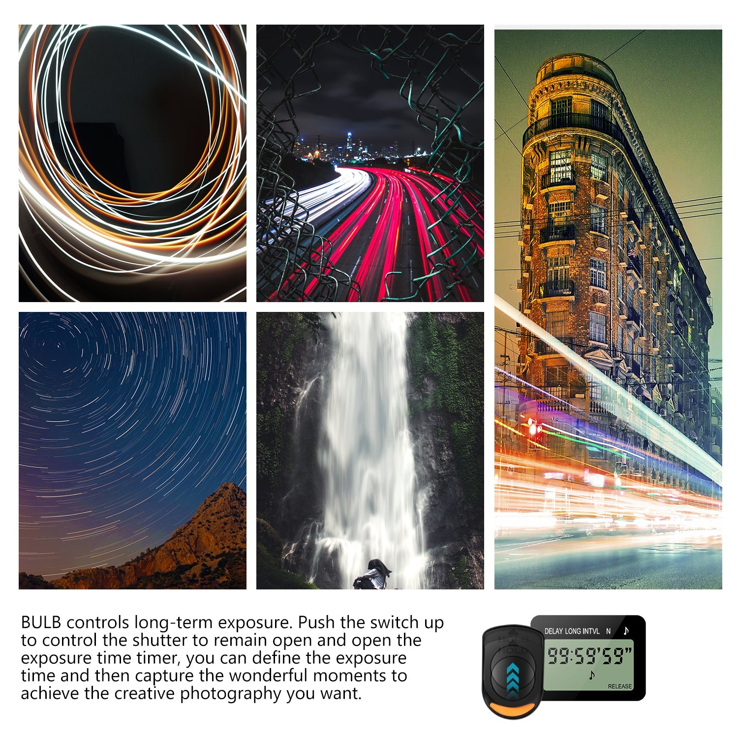 - Este cable remoto multifunción proporciona una función de temporizador automático, puede elegir el retraso (tiempo antes de que comience el disparo), el tiempo de exposición, el intervalo y el número de disparos para la fotografía a intervalos cronometrados. La cámara puede seleccionar la velocidad de obturación si lo desea. También tiene un desbloqueo manual. Tome fotografías manualmente utilizando el disparador del cable del control remoto. Las fotografías se pueden tomar manualmente incluso cuando el cronómetro está funcionando.