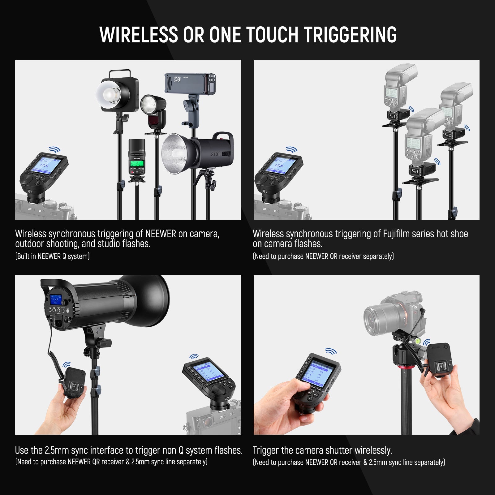 - Sistema Q inalámbrico 2.4G integrado : Dispare de forma inalámbrica los flashes NEEWER Q4, Q3, Z2-C, Z1-C , Z760-C, NW420-C, NW655-C, NW665-C, S101-300W PRO y S101-400W PRO gracias al sistema Q inalámbrico NEEWER integrado, o controle otros flashes sin sistema Q mediante un receptor QR NEEWER y un cable de sincronización de 2,5 mm (se venden por separado).
