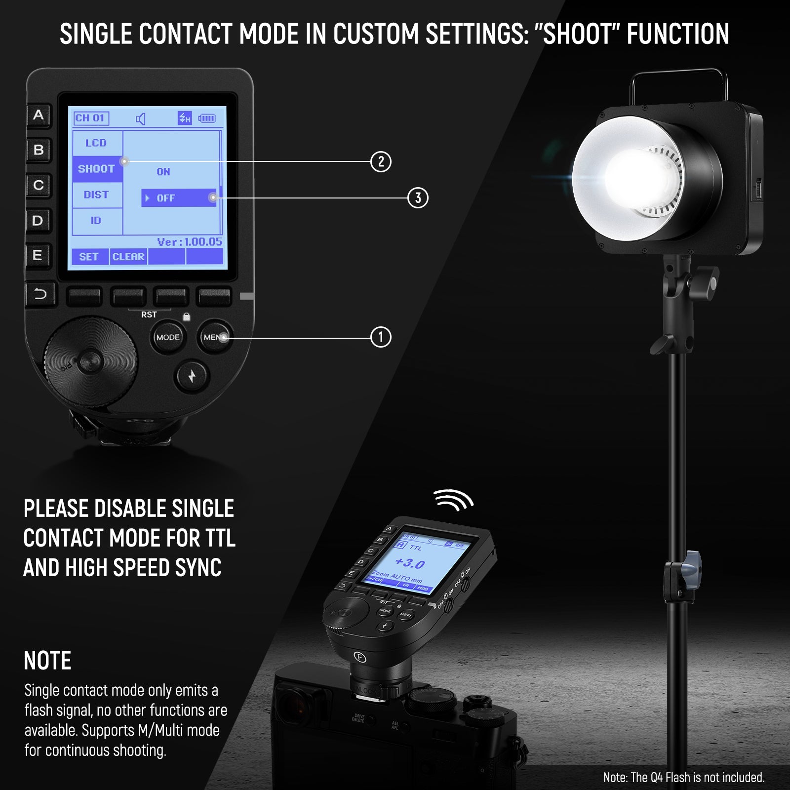 - Disparador de flash profesional versátil: Este disparador de flash inalámbrico QPRO-C es potente y admite una amplia gama de funciones, como TTL, sincronización de alta velocidad de 1/8000 s, flash múltiple, flash manual, compensación de exposición del flash (FEC), función de aumento, control de lámpara de modelado de grupo, zoom de grupo, disparo de punto único y más. También puede ajustar los valores de salida de todos los grupos simultáneamente. Nota: Desactive el modo de contacto único "SHOOT" para TTL y sincronización de alta velocidad.