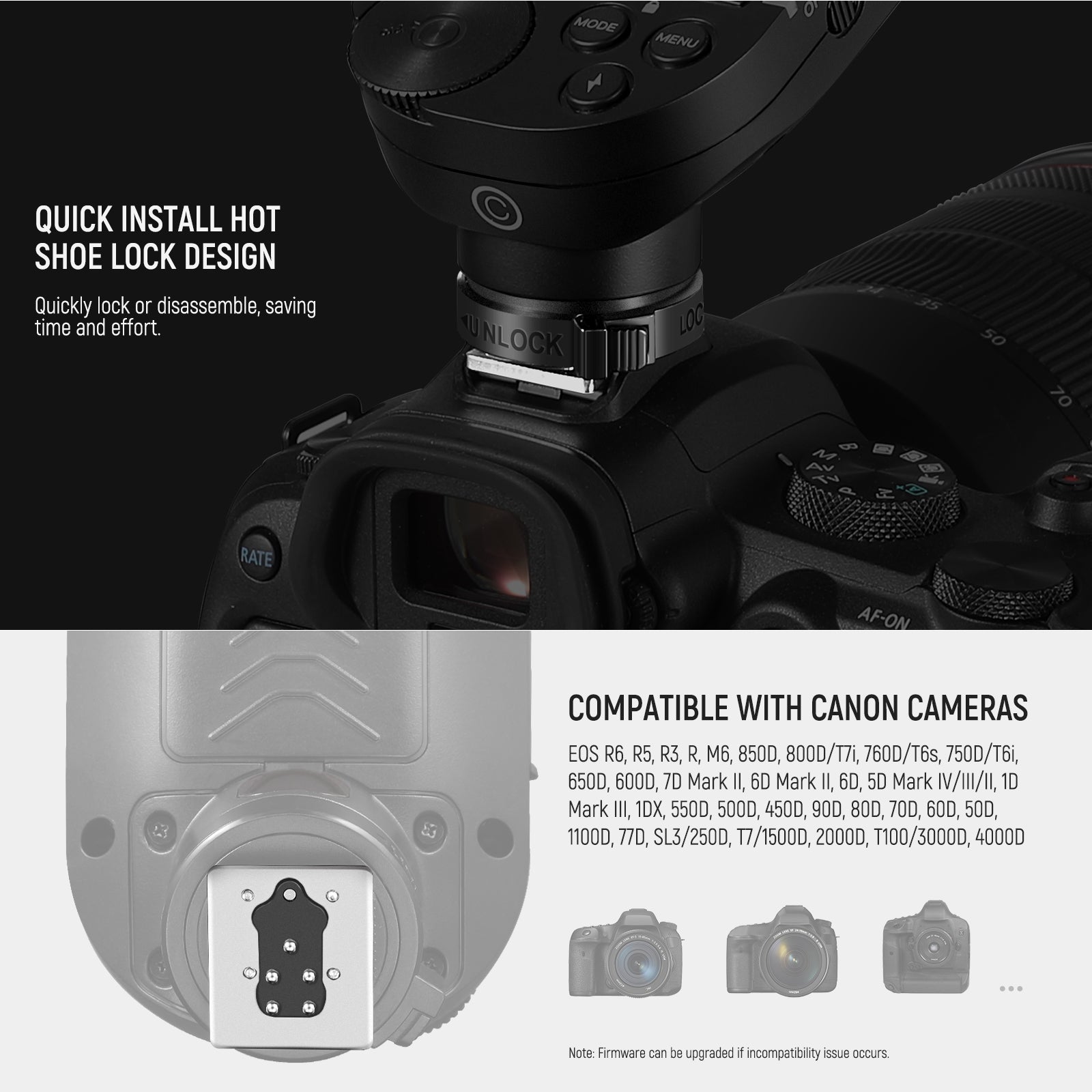 - Amplia compatibilidad : El disparador de flash QPRO-C se fija rápidamente a la cámara gracias a su zapata metálica. Compatible con Canon EOS R6, R5, R3, R, M6, 850D, 800D/T7i, 760D/T6s, 750D/T6i, 650D, 600D, 7D Mark II, 7D, 6D Mark II, 6D, 5D Mark IV/III/II, 1D Mark III, 1DX, 550D, 500D, 450D, 90D, 80D, 70D, 60D, 50D, 1100D, 77D, SL3, T7/1500D, 2000D, T100/3000D, 4000D (no compatible con RP R50). Nota: Hay actualizaciones de firmware disponibles para solucionar problemas de compatibilidad.