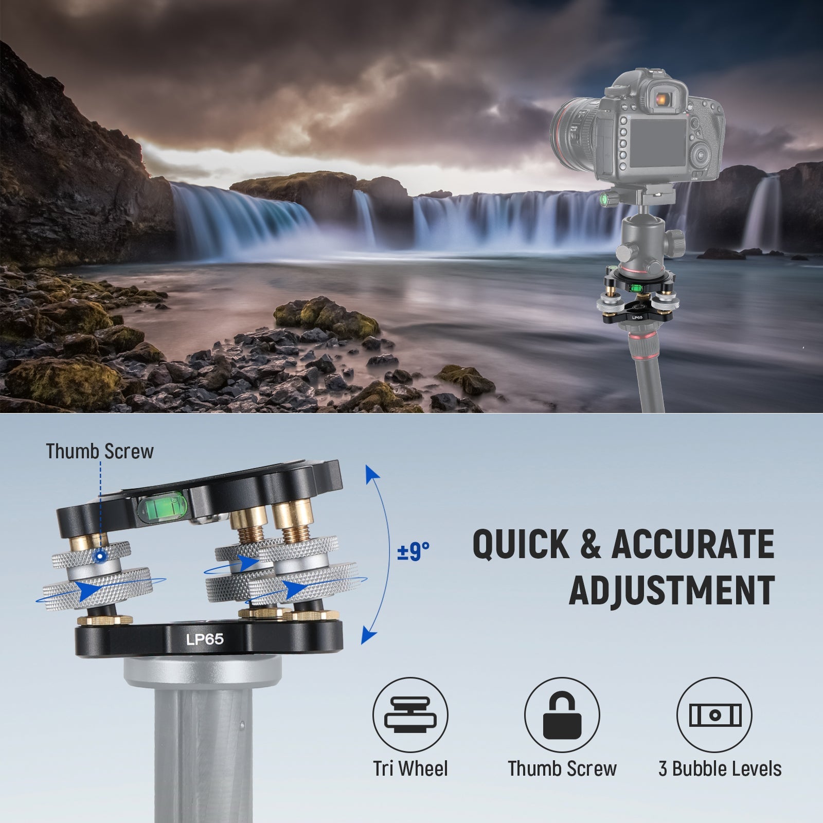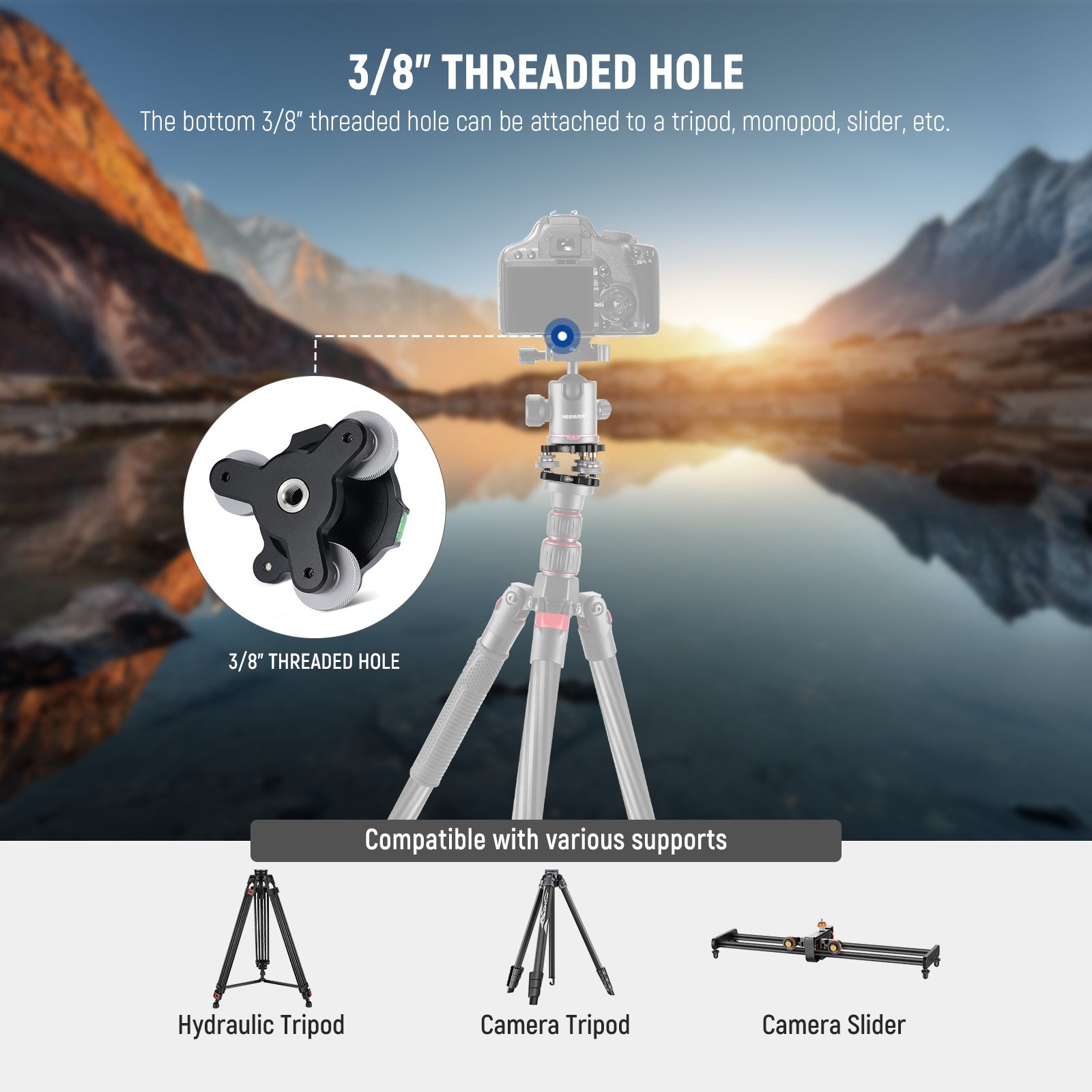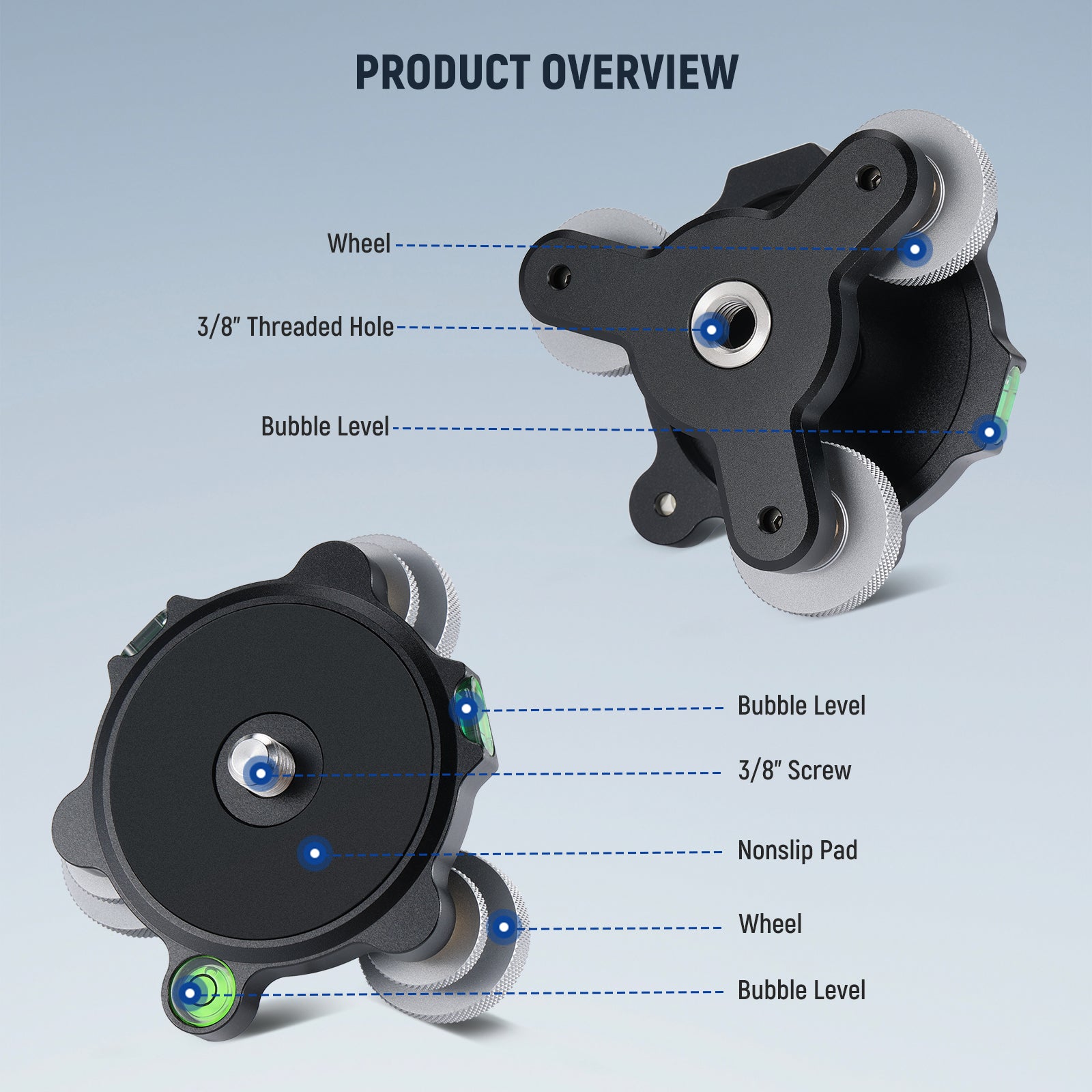 - Base niveladora de trípode con nivel de burbuja : la base niveladora de trípode cuenta con tres pilares de soporte cortos que brindan ajustes de nivelación de hasta +/-9° con tornillos de mariposa. Los niveles de burbuja incorporados ayudan a verificar el nivel de la cámara de un vistazo y siempre la mantienen recta. El orificio roscado inferior de 3/8" se puede conectar a un trípode, monópode, deslizador, etc.