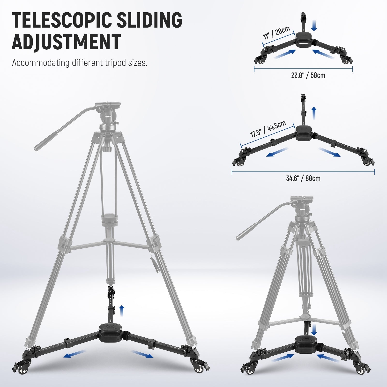 - Ajuste telescópico y deslizante : el trípode de video puede extender su diámetro de 11"/28 cm a 17,5"/44,5 cm, lo que se adapta a diferentes tamaños de trípode y ángulos de apertura, y mejora la adaptabilidad a espacios de estudio reducidos o ubicaciones al aire libre expansivas.