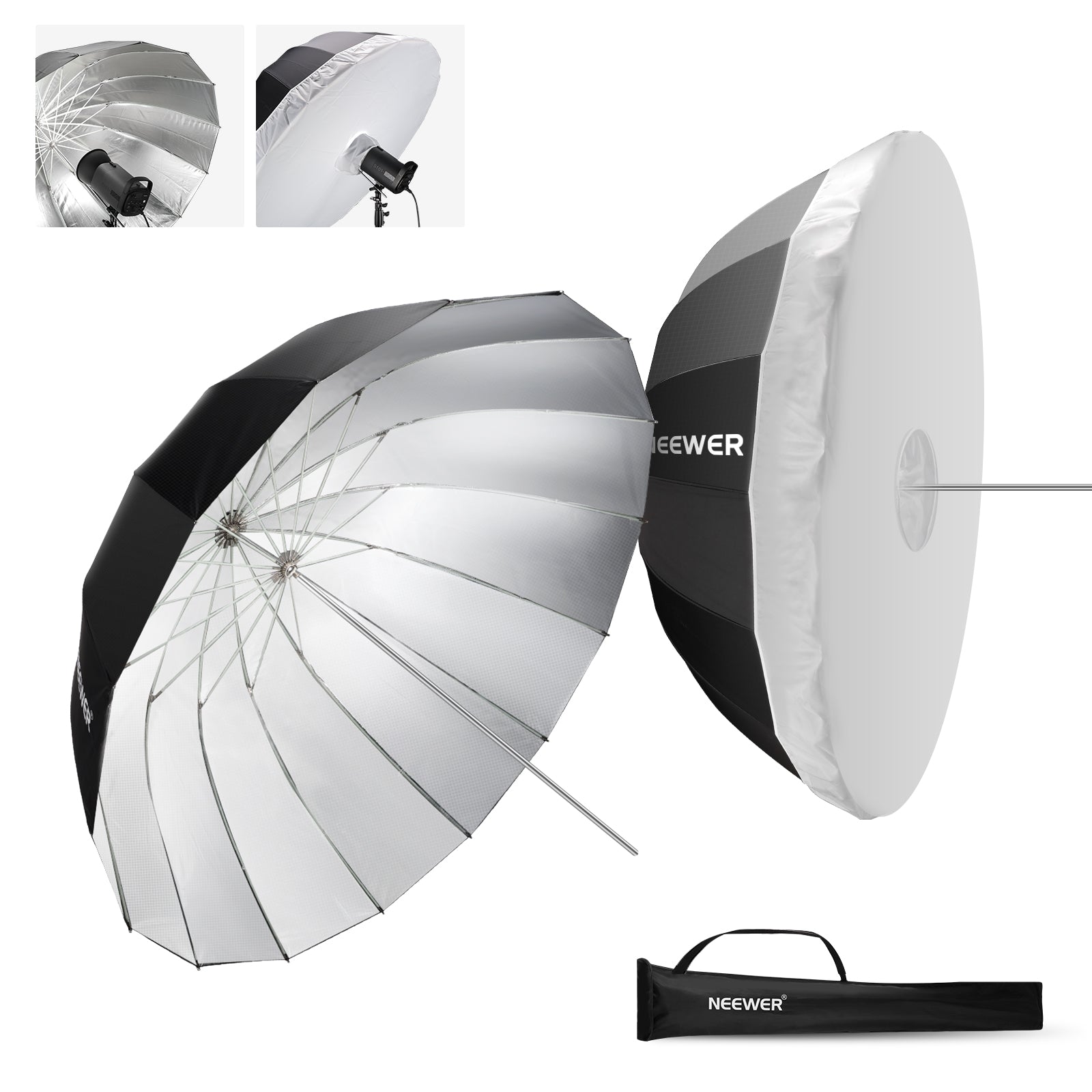 - Paraguas reflectante parabólico blanco/negro de 41"/104 cm : este softbox tipo paraguas parabólico de 41"/104 cm de profundidad proporciona un efecto de luz más suave y más uniformemente difundido que la versión negra/plateada, y conserva una temperatura de color neutra para una reproducción fiel del color. Perfecto para retratos de grupo o paisajes amplios. Su diseño en forma parabólica permite una mayor difusión de la luz.