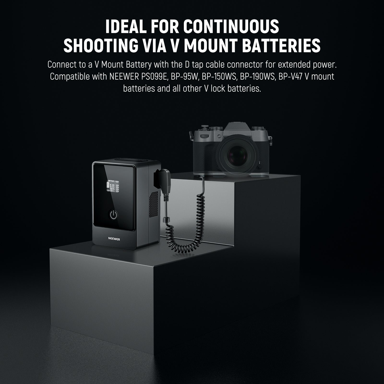 - Ideal para disparos continuos a través de baterías con montura V : con un conector de cable D-Tap, esta batería ficticia D-Tap a NP-W126S puede funcionar con baterías con montura V NEEWER PS099EP, PS099E, PS150E, PS050E y todas las demás baterías con montura V con un conector D-Tap. Compatible con la serie de baterías con montura V de SmallRig, compatible con baterías con montura V Sony BP-U65, BP-U68, BP-U100 y BP-U90