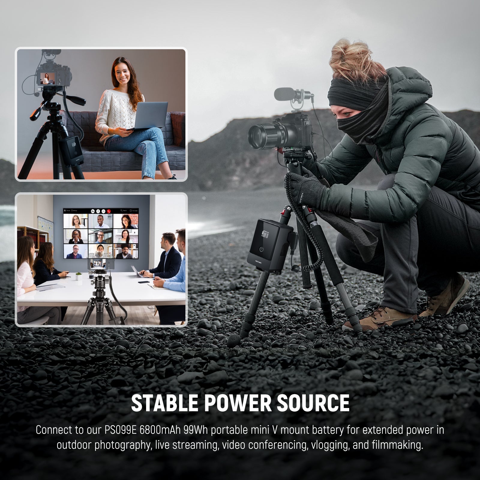 - Energía estable para grabaciones más largas y seguras : olvídate de las fallas de los cables y protege tus grabaciones más importantes. Nuestro chip inteligente garantiza una fuente de alimentación constante y estable para tus creaciones. Conéctate a nuestra batería portátil PS099E de 6800 mAh y 99 Wh con montura en V para obtener energía extendida en fotografía al aire libre, transmisión en vivo, videoconferencias, vlogs y realización de películas.