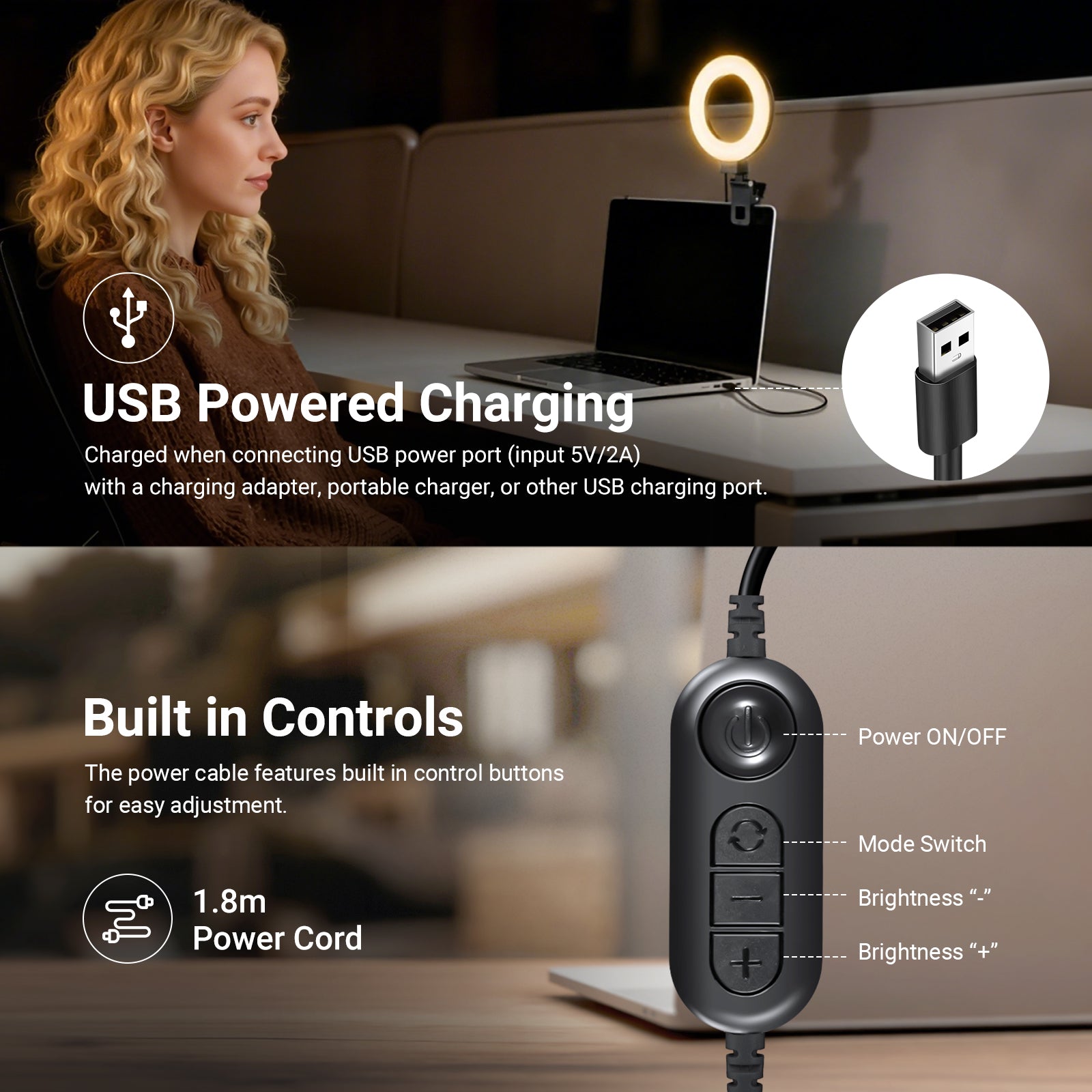 - Carga alimentada por USB : el anillo de luz LED de 10 W funciona a 5 V/2 A, con un cable de carga incorporado de 6 pies/1,8 m, y se puede alimentar a través de puertos USB desde pantallas, computadoras portátiles, fuentes de alimentación móviles o cargadores de teléfonos, lo que proporciona soluciones de iluminación energéticamente eficientes y respetuosas con el medio ambiente.
