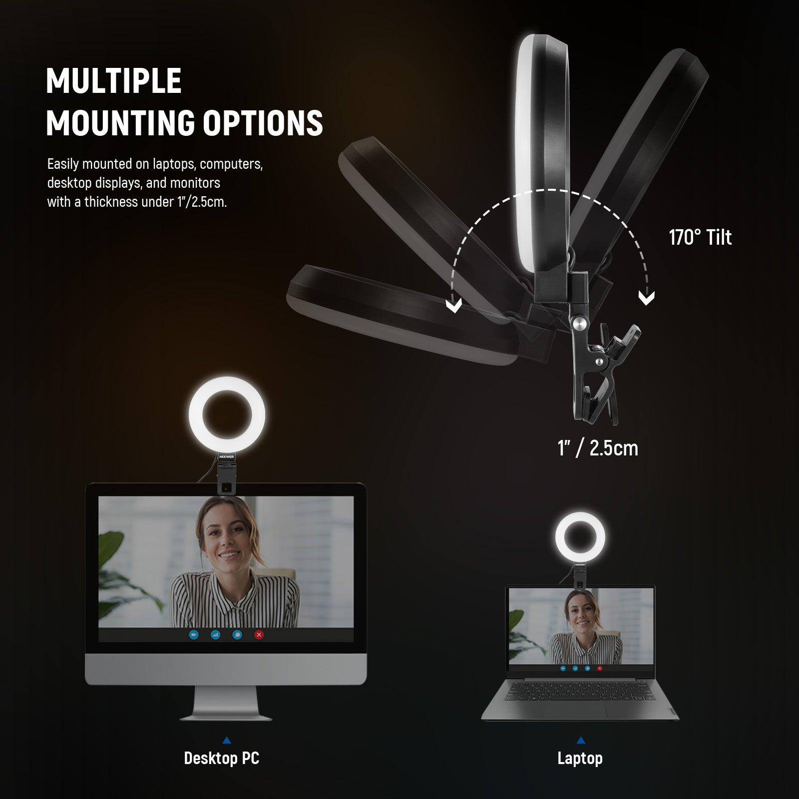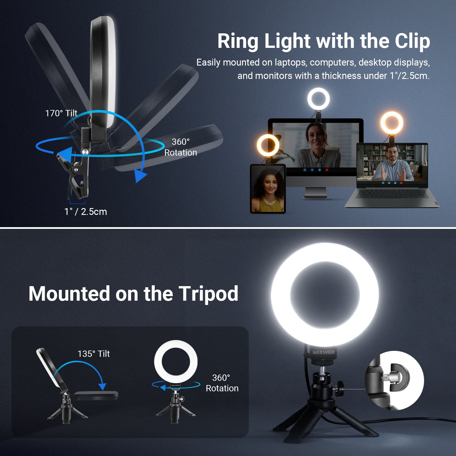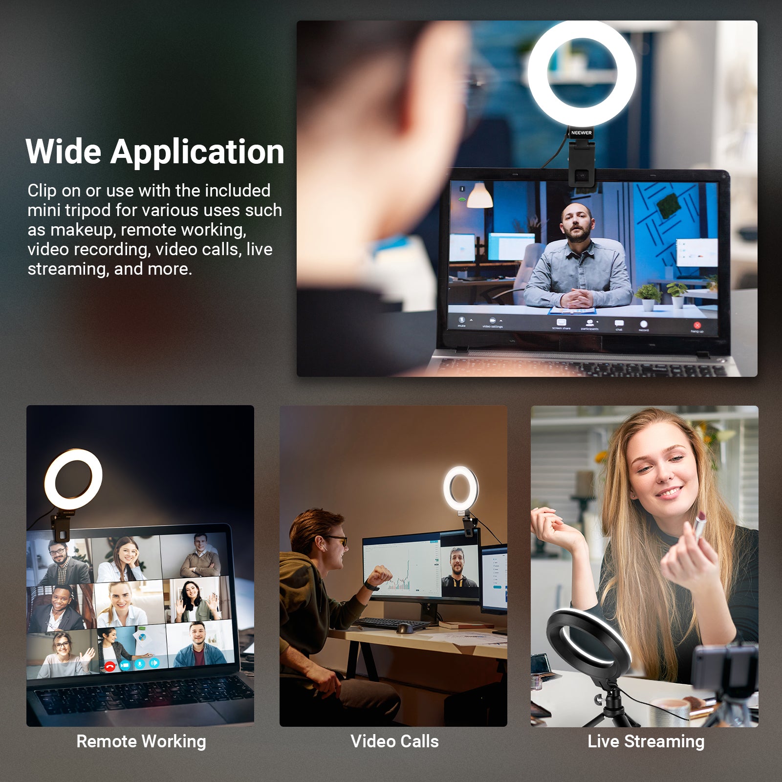- Luz de relleno LED versátil con clip : equipada con 60 LED, la luz de anillo NEEWER BR60 ofrece una iluminación de hasta 450 Lx a 0,5 m, una temperatura de color de 3000 K-6000 K y un CRI>97. La luz con clip se puede montar en teléfonos inteligentes, computadoras portátiles, computadoras, pantallas de escritorio y monitores con un grosor inferior a 1"/2,5 cm, e incluye un mini trípode para un uso versátil en maquillaje, selfies, grabación de videos de Tiktok/Youtube, Facetime, llamadas de Zoom, videoconferencias, transmisión en vivo, vlogs, etc.