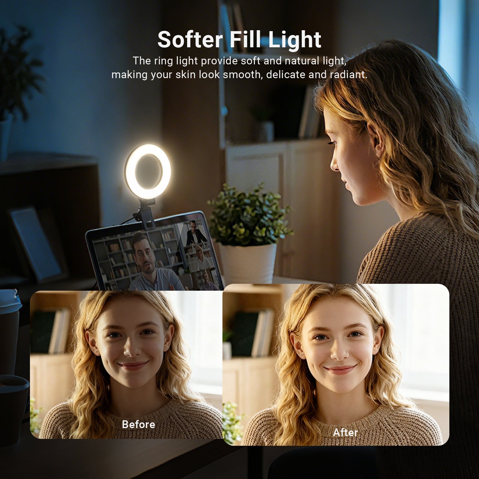 - Ligero y portátil : el mini trípode resistente soporta hasta 6,6 lb/3 kg y se puede usar con otras luces LED de relleno, micrófonos o monitores a través de su tornillo de 1/4". El aro de luz con clip pesa 4,6 oz/131 g, mientras que el peso combinado del aro de luz y el trípode es de 6,6 oz/188 g, con un diseño liviano y desmontable para llevarlo a todas partes.